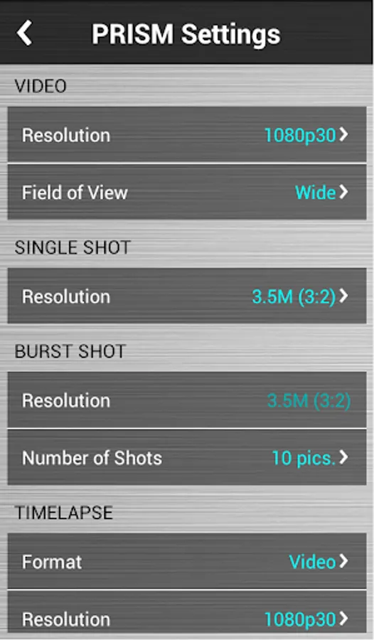 The Sena Prism App allows you to configure video settings, audio settings, and device settings, and view the Prism Quick Start Guide.