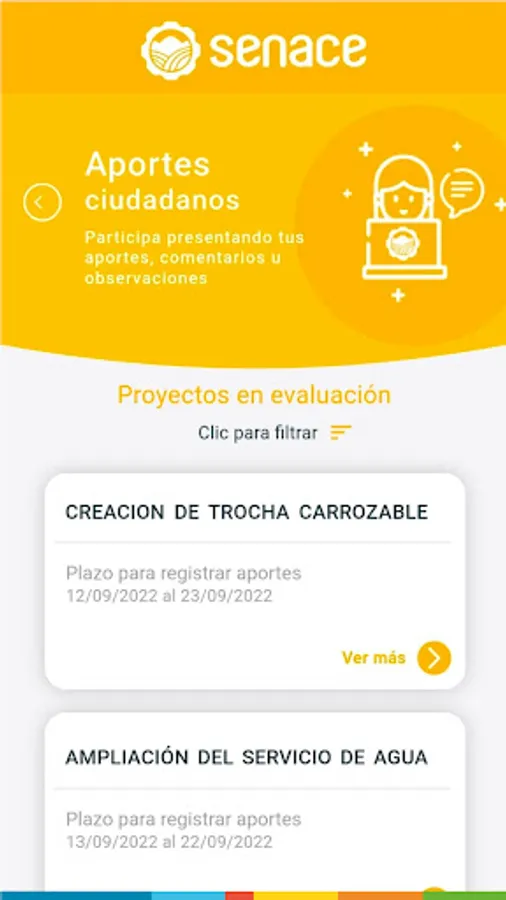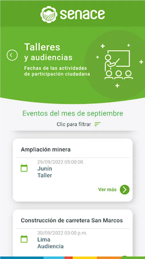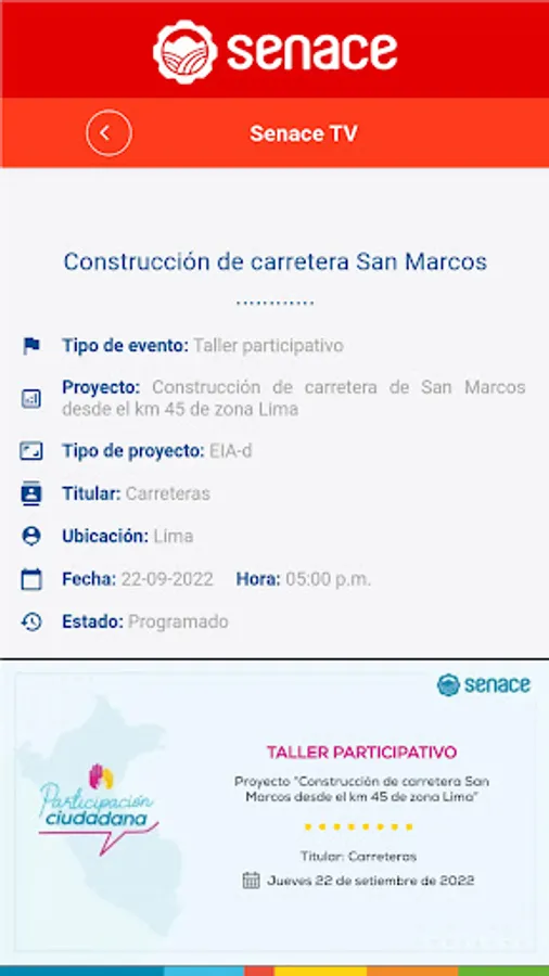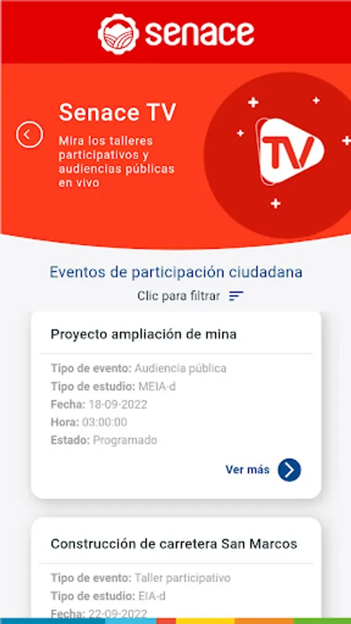 Access information on the investment projects that Senace evaluates and exercise your right to citizen participation. Learn about the workshops and public hearings and participate with your contributions and comments. Also, check the calendar of events, the live broadcasts via Senace TV and the georeferenced data of the projects.