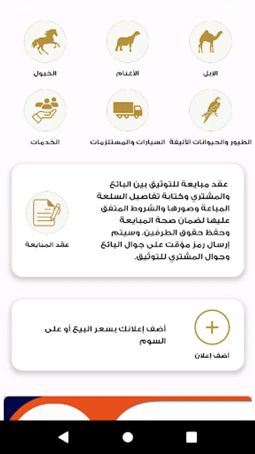 Rasan application for buying and selling offers for camels, horses, sheep, birds, all types of pets, car sales, and supplies. We also provided an electronic contract of allegiance service to document the pledge of allegiance between you and the other party. There are also free services for halal owners, such as jewelry stores, veterinary pharmacies, transportation, delivery, and others.