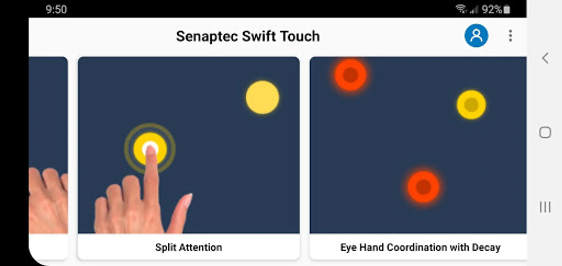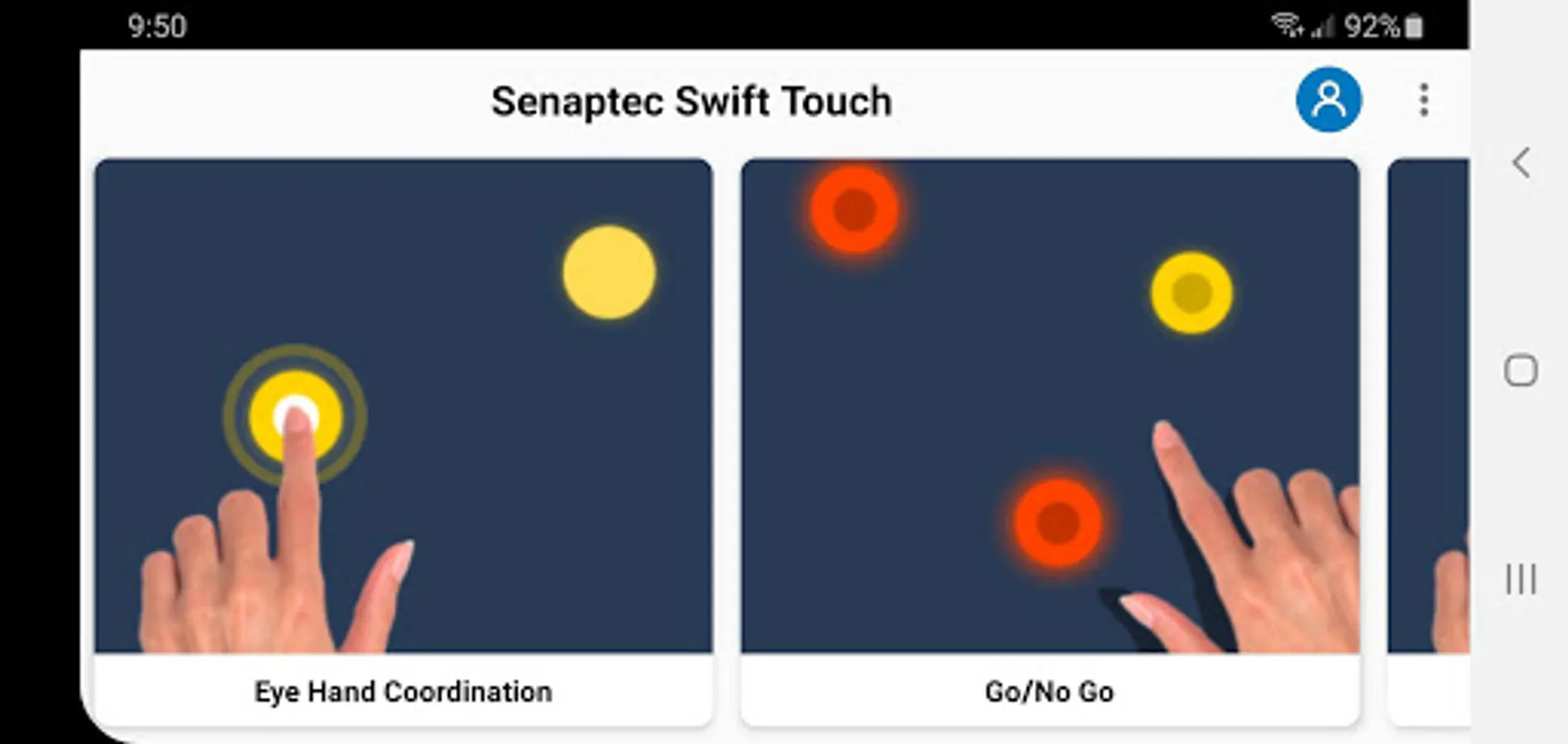 The Senaptec Swift Touch is a large portable LED button board with a central screen designed to train several sensory and motor skills including eye hand coordination, reaction time, visual memory, and split attention. The Swift Touch App provides the interface to control the device. The app configures the operation of the 72 multi-color LED buttons, stores user settings, and provides historical performance data. In addition, the Swift Touch App runs the central screen on the Swift Touch, providing stimulus for split attention activities. The Swift Touch App is designed to interface with the Senaptec Swift Touch board over a USB connection and provides little stand-alone functionality.
