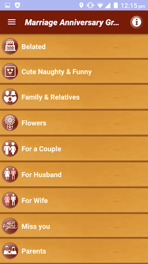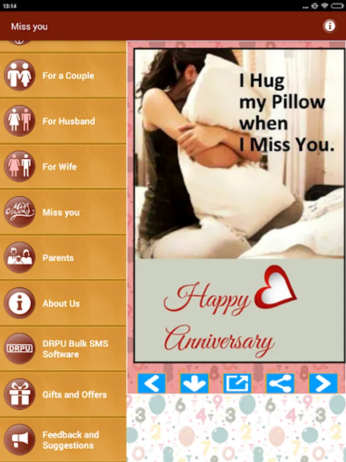 App has variety of Wishes for all connections and relations including Family and Relatives or For a Couple or Parents Mother Father Brother Sister or Son and daughter. Messages wishes Quotes on beautiful photos to refresh their special day of life. Choose from the Messages to express your feelings on their special day including Cute Naughty and Funny or Missing You and Belated or Love and Romantic etc.