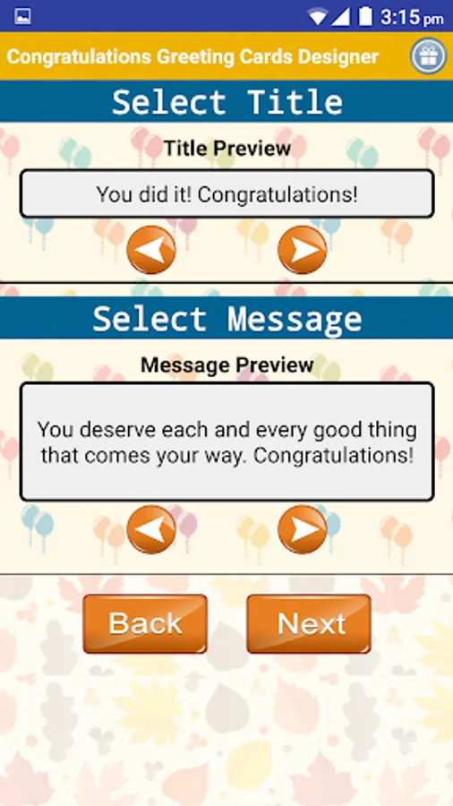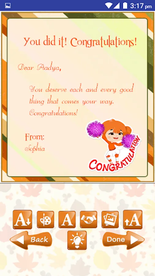 Congratulations Wishes Greeting Cards Designer is a Free app that allows you to Design & Share beautiful Congrats Greeting Cards & wishes and send to your loved ones in 3 easy steps from our Free Card Templates as easy as:
