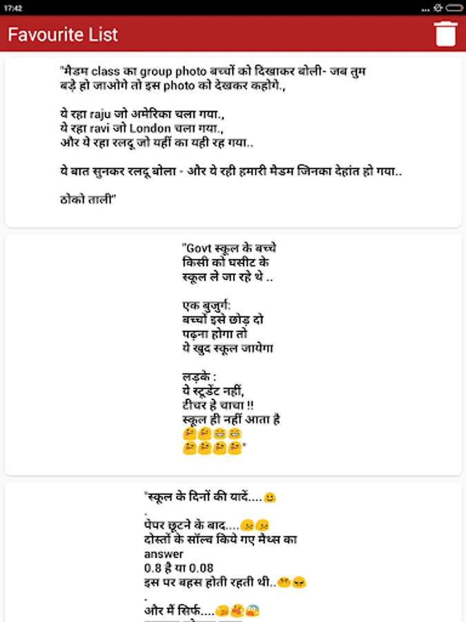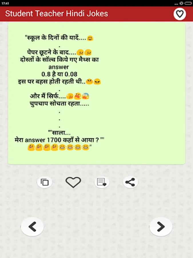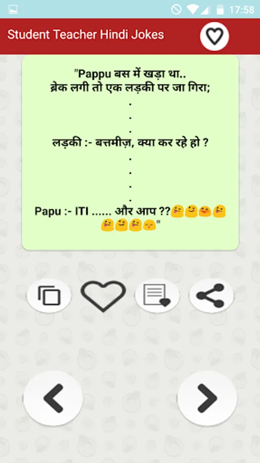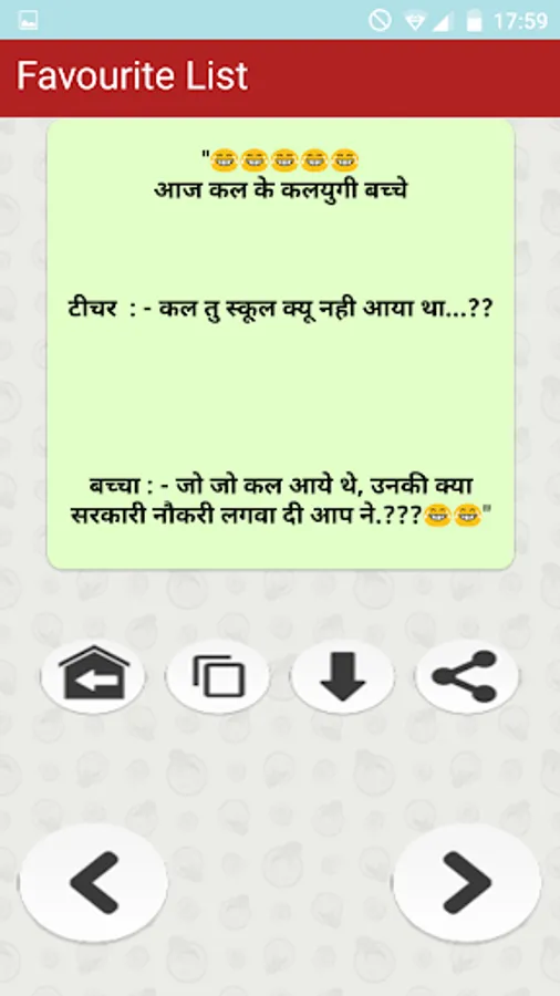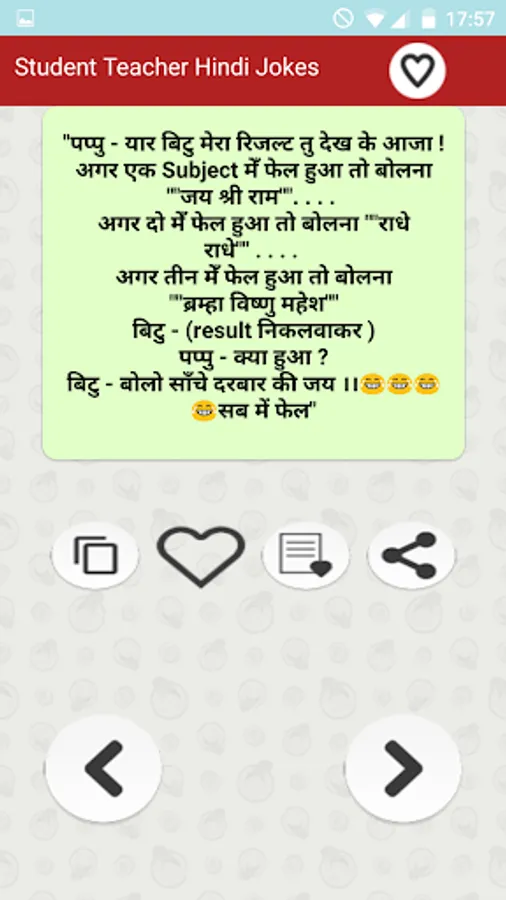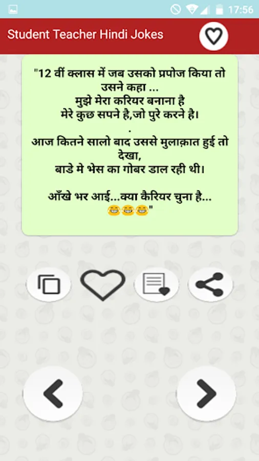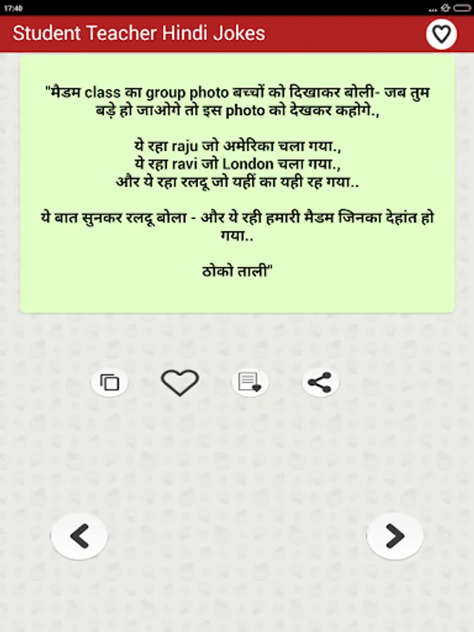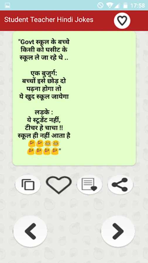 स्टूडेंट टीचर हिन्दी जोक्स मजेदार फनी चुटकुले का यह फ्री एप्प प्रमुखता से भारतीय पाठकों को ध्यान में रखकर बनाया गया है... Student & Teacher Funny Hindi Jokes free app is the collection of all type of latest अध्यापक छात्र मास्टर जी etc हिन्दी Jokes of all major Fun jokes categories that are popular in India and are most liked by Indian people. Primary collection is based on humor and funny dialogues about students teachers schools and college life etc. Additionally app also has a number of other funny categories.