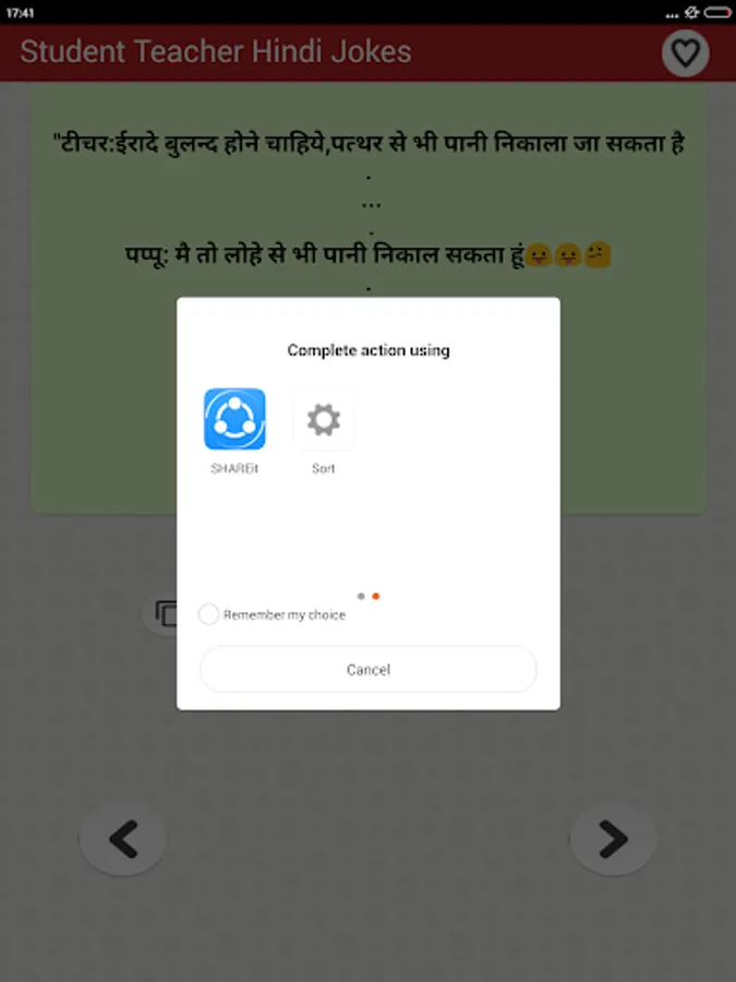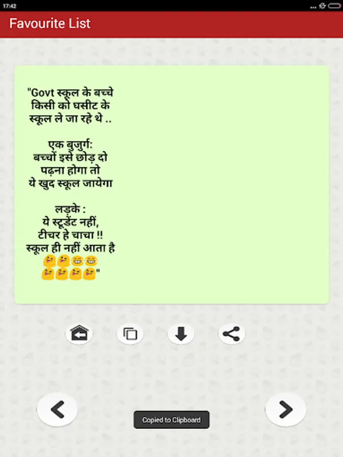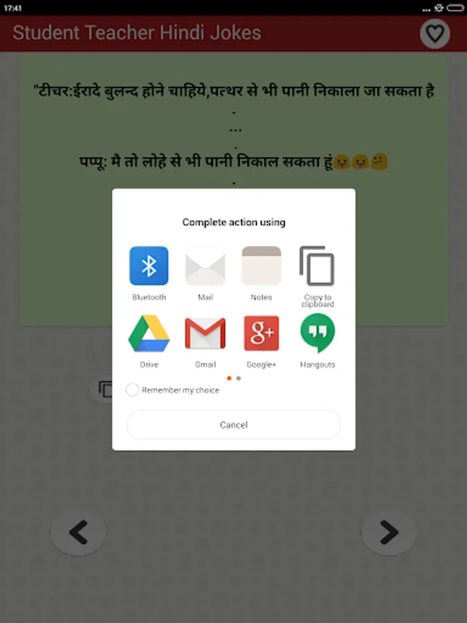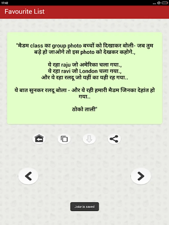 The collection of top most funny & entertainment Hindi Jokes that you can Enjoy sharing with your friends and family members over social networking sites like Facebook twitter whatsapp etc. You can download share or send any joke by just a single tap on social media websites such as Facebook Instagram twitter Linkedin Google etc as well as on chat messengers such as WhatsApp Snapchat Hike etc. You can also save Jokes as text or as Picture in JPG or PNG Format to your mobile phone internal storage memory or in your cell Phone SD Card and can share later as photo.