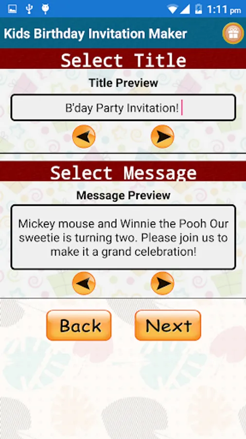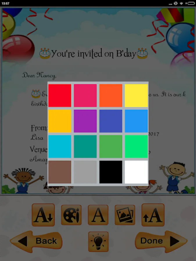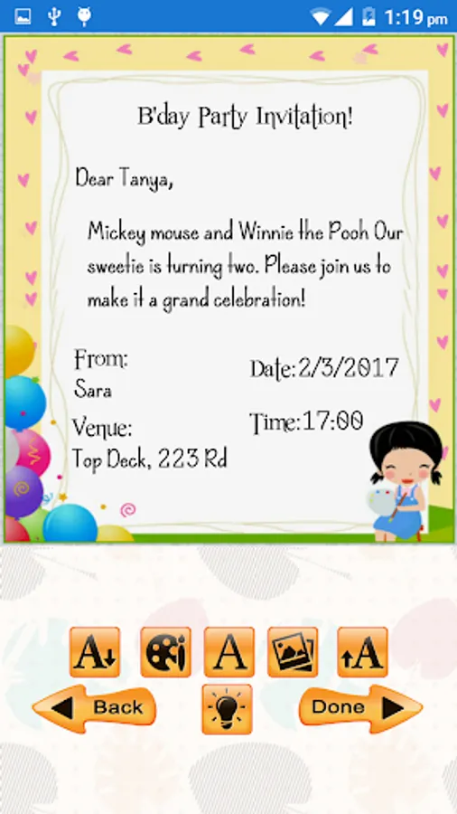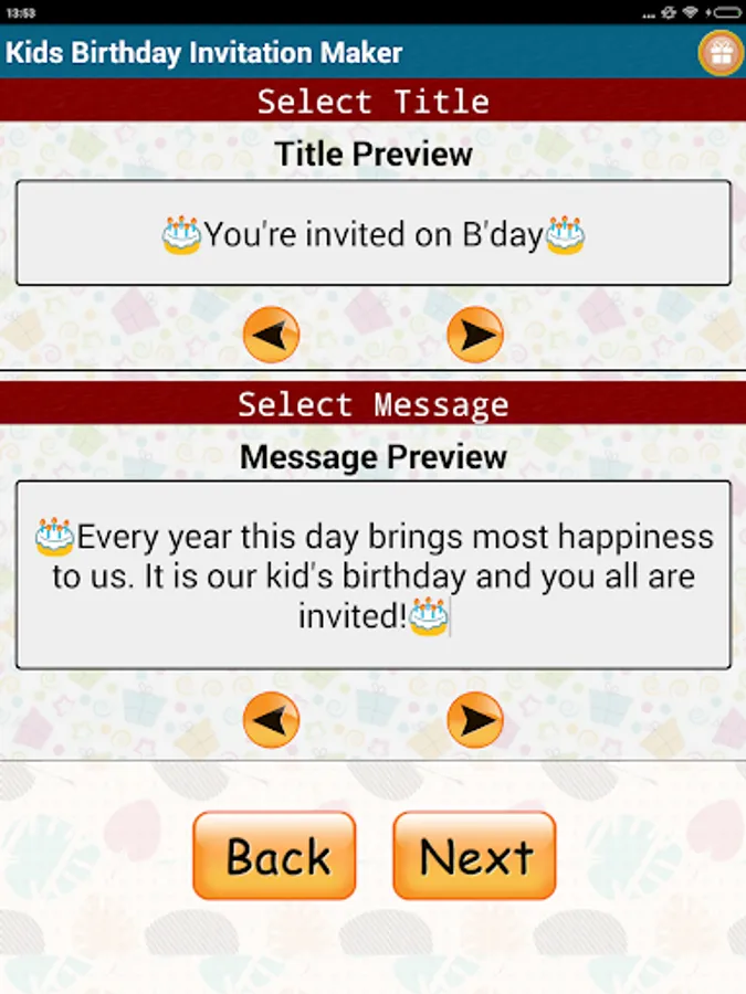 Kids Birthday Party Invitation Cards Maker Free app allows you to Design & Share your own custom Invitation for the birthday party of your birthday girl or birthday boy. Kids Birthday Party Invitation Cards Maker and Designer Card generator to Invite Guests to all type of Birthday functions party in just 3 easy steps from our Free Card Templates collection. Designing and sending invitation with our app is as easy as: