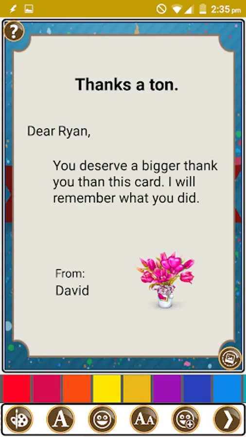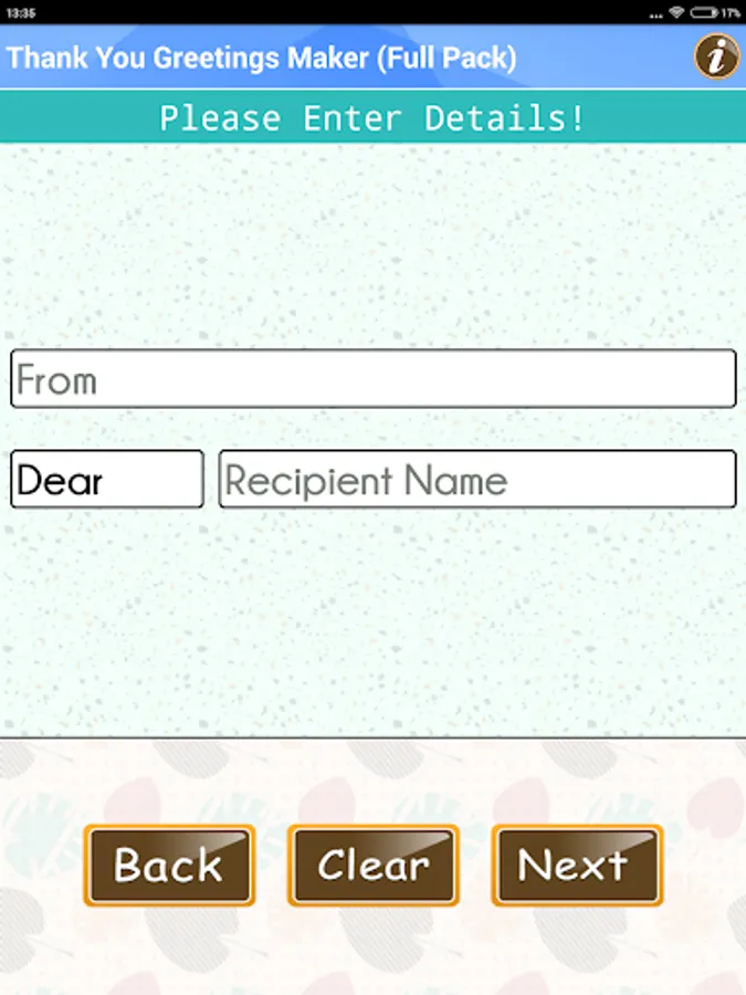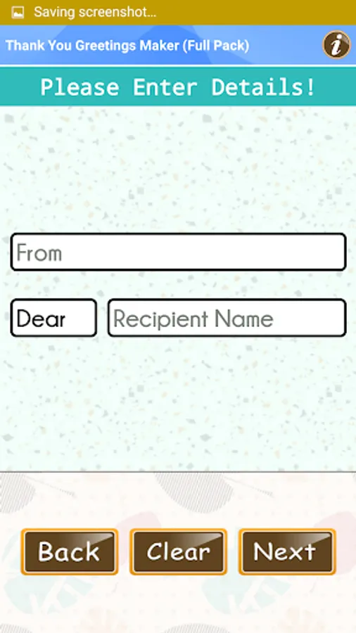 You can add sticker on your designed greeting card or browse image from gallery as per your need. Greeting maker app allows user to add customized greeting title and message on greeting card and then enter to and from details accordingly. Thank You Greeting Maker app provides facility to save designed Thank You Greeting Card and share via Whatsapp Google+ Facebook Gmail Twitter etc.
