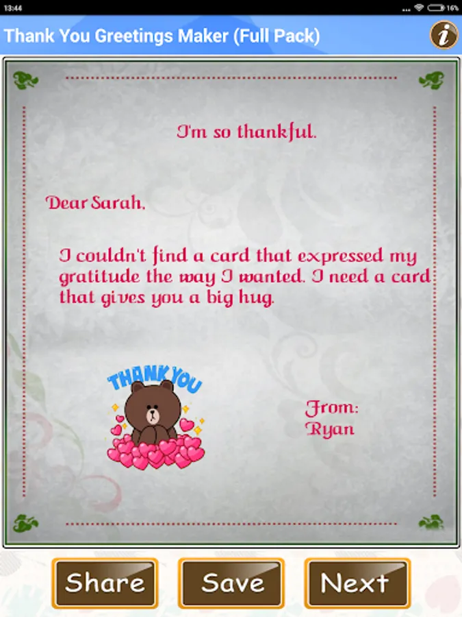 Full Pack of Thank You Greetings Maker app allows you to create personalized Thank You Greeting Cards for your friends family member relatives and loved ones to share your feeling that how grateful you are. This Free Android App provides facility to design attractive Thank You Greeting Cards with pre-designed templates available in the app. This App has really Big Collection of Thank you wishes messages and Quotes Images for all relations including: