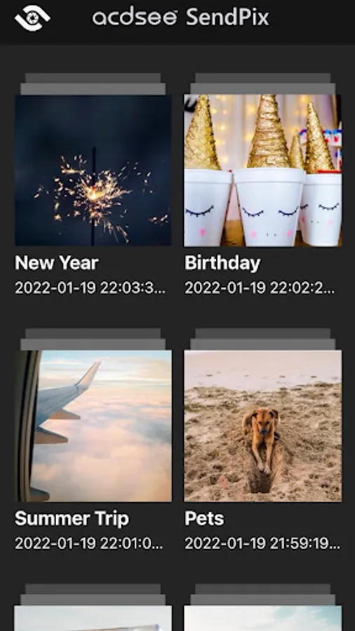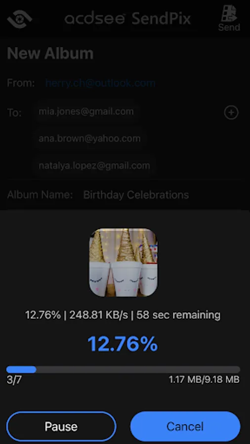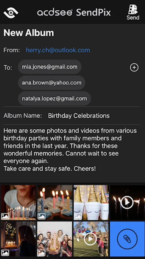Sending media is free and simple with ACDSee SendPix. Open the app and attach the media you want to share, enter the email addresses you want to send to, add an album name and a message, and send! Recipients will receive the album almost instantly!
