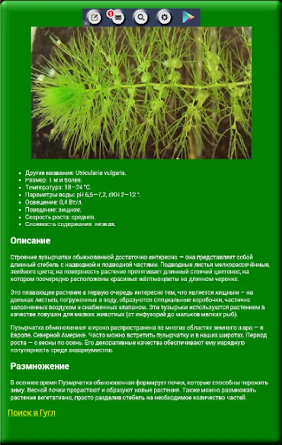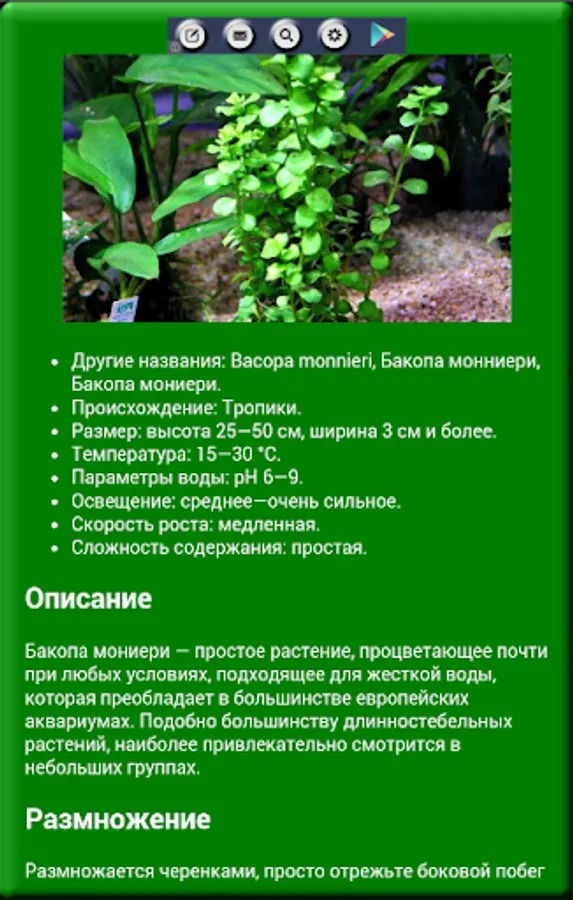 Brief Description of aquatic plants, synonyms, origin, size, temperature, water quality parameters, beam, complexity, etc.