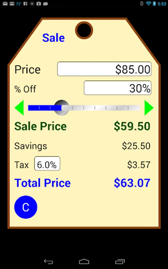 A simple and easy to use app that determines what you will save and what your final price will be after applying a store's discount and any applicable taxes. If you can move your finger you can figure percentages. Automatically determines the amount of sales tax and total value as you enter values or move the sliding percentage bar. Especially useful for whole store percentage off sales. Includes a nice calculator.