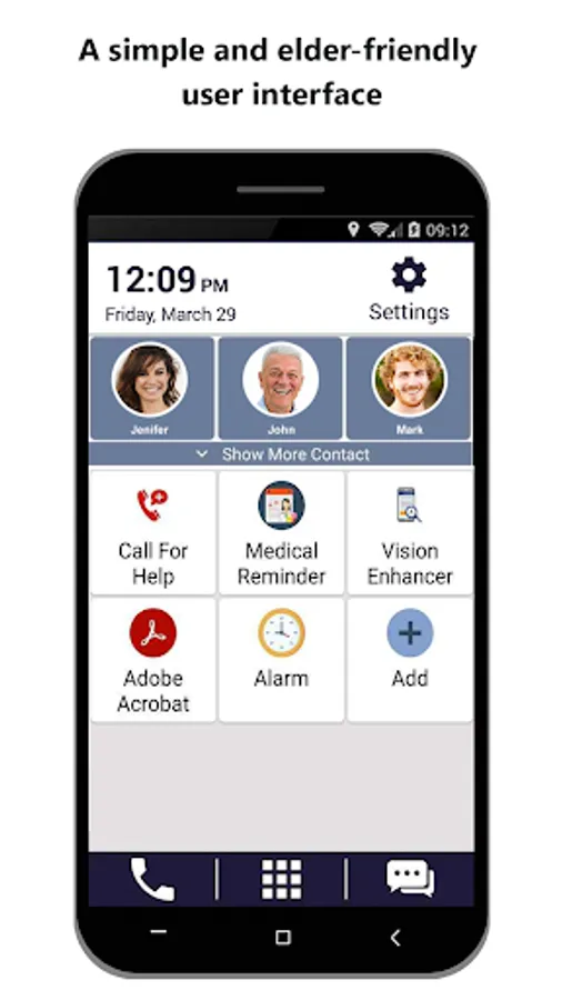 Give your smartphone a completely new look. Large buttons to help those elderly hands. Single touch access to the most frequently called contacts. All the basics of making calls, receiving, and sending text messages are simply made stress-free.