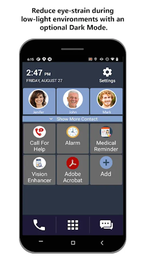 • Maximize Readability. Give your smartphone a completely new enlarged home screen comprehensively designed for stress-free navigation. Access all the functions of your phone with large texts and colorful buttons to help you distinguish between items. Reduce Eye-Strain during low-light environments with an optional Dark Mode.