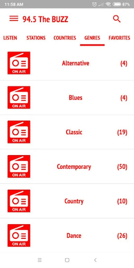 - Choose between sports, news, latin music, hits, pop, rock and other musical styles.