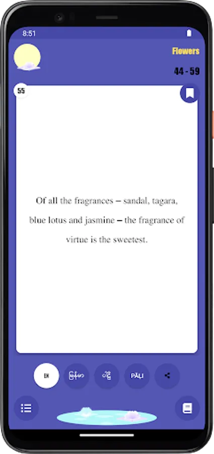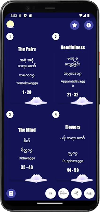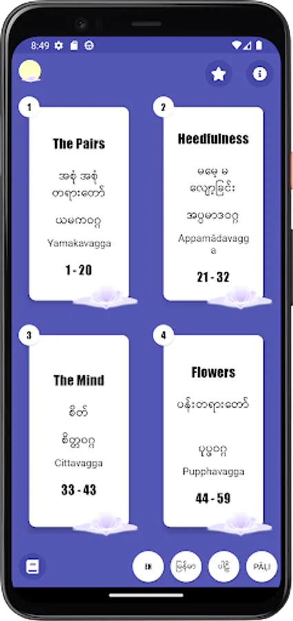 The Dhammapada is a collection of sayings of the Buddha in verse form and one of the most widely read and best known Buddhist scriptures. With ( English, Myanmar, Burmese: ပါဠိ Pali)