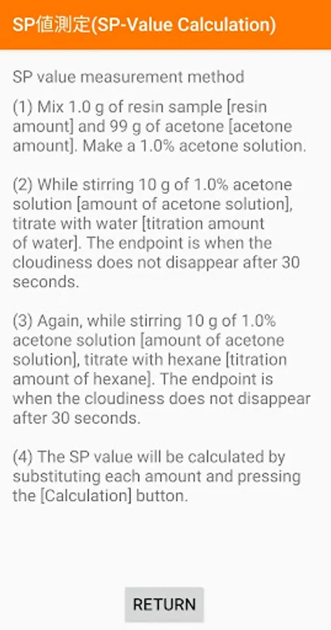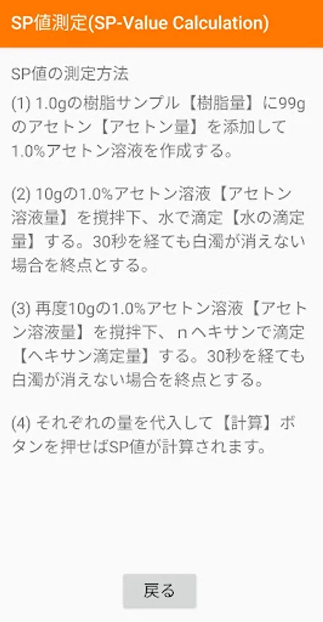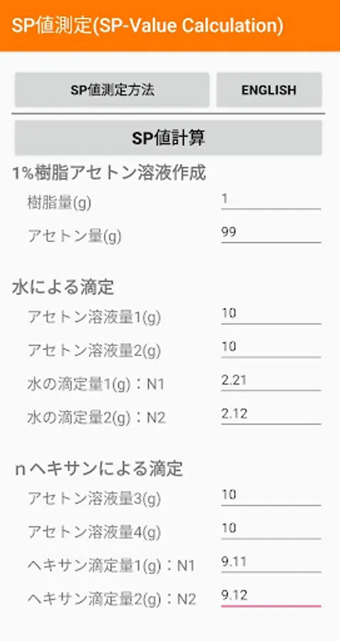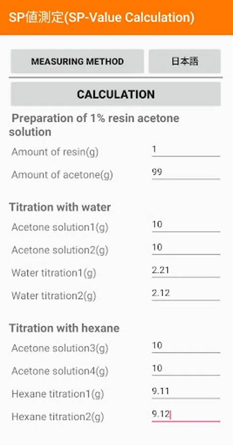 In the titration experiment, acetone was used as a good solvent to dissolve the resin, and water and hexane were used as poor solvents. The SP value of the resin can be calculated simply by inputting the titer in this app.