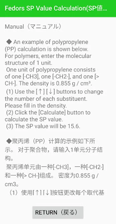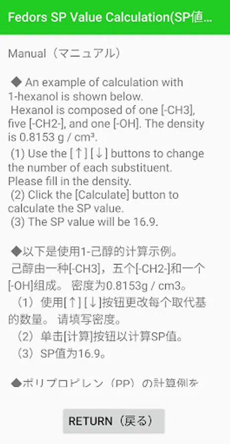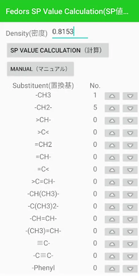 Solubility parameter (SP value) is an index of solubility. This is an application that can calculate the SP value of resin and solvent from the molecular structure. Currently, this app supports "Japanese" and "English".