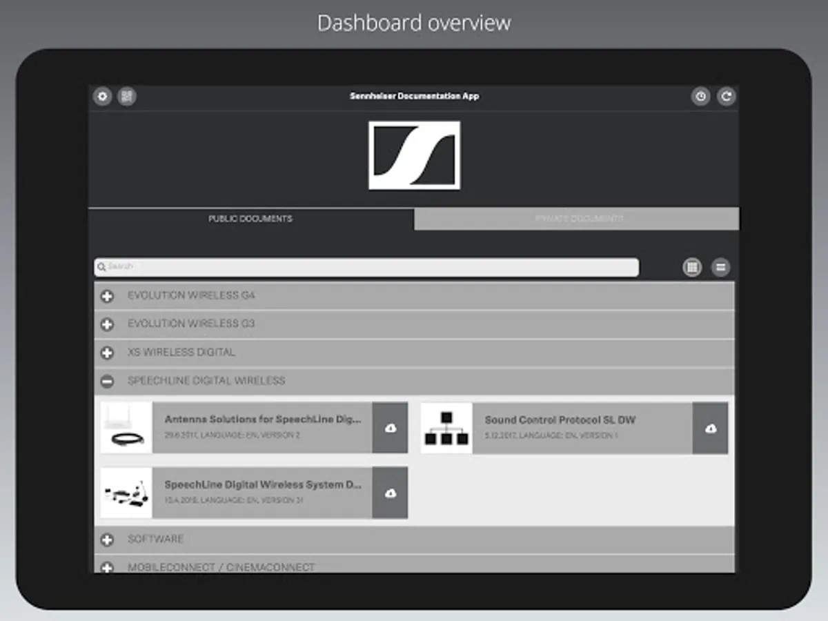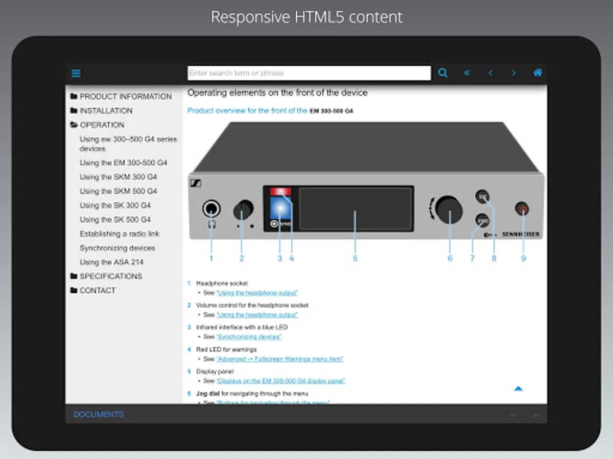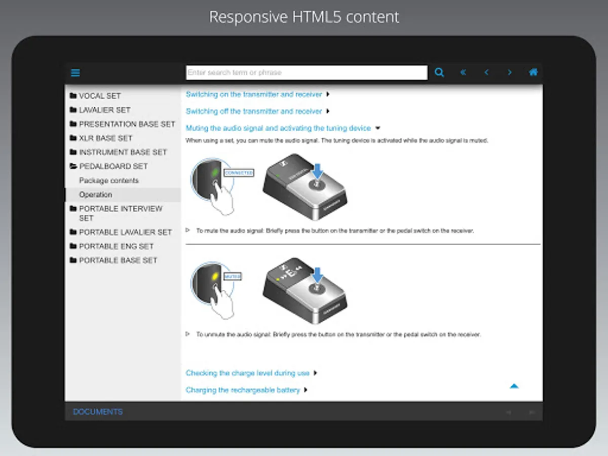 The Sennheiser Documentation App provides interactive access to all relevant product information and technical documentation in responsive HTML5 design. Documents can be displayed online or downloaded into the offline mode in multiple languages. The user will be notified about updates of any documents. Product documentation becomes interactive and more vivid.