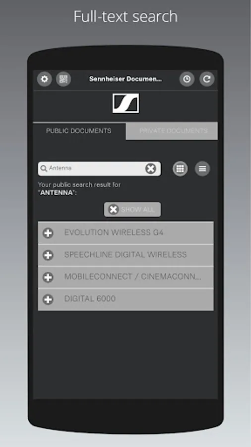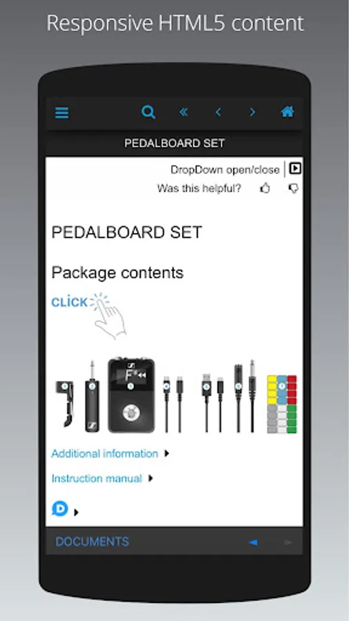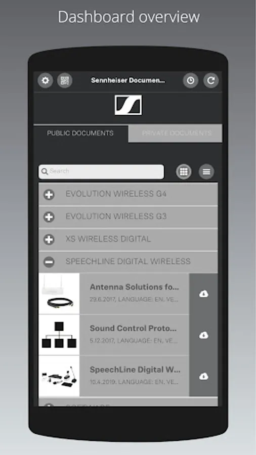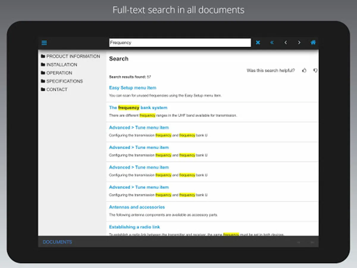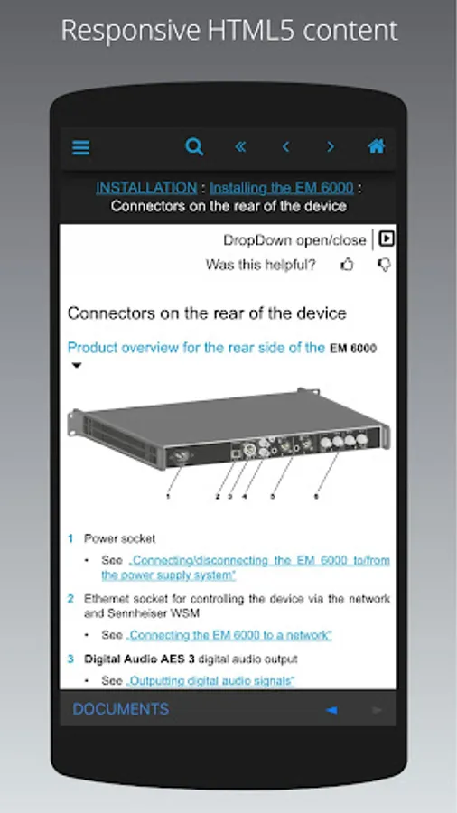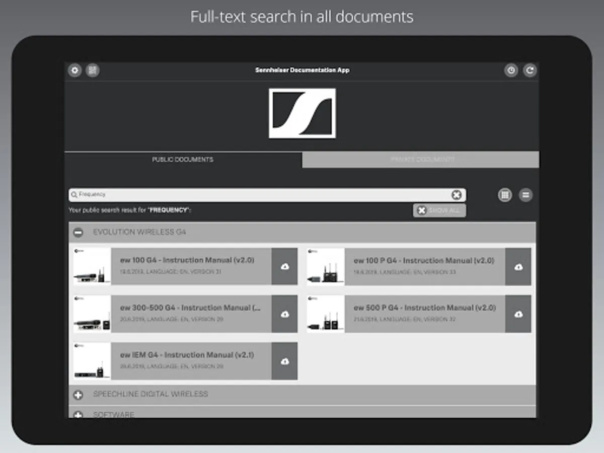 The Sennheiser Documentation App provides interactive access to all relevant product information and technical documentation in responsive HTML5 design. Documents can be displayed online or downloaded into the offline mode in multiple languages. The user will be notified about updates of any documents. Product documentation becomes interactive and more vivid.
