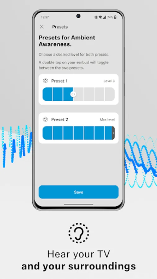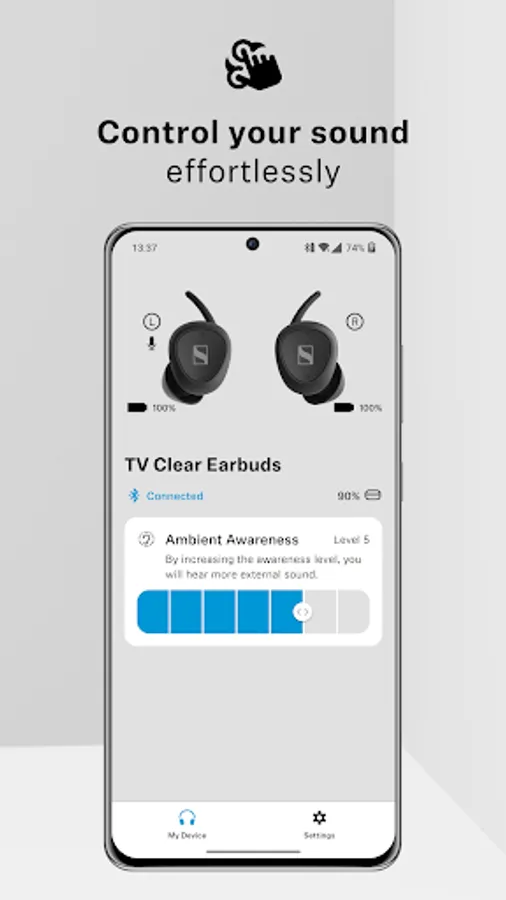 The Sennheiser True Wireless TV earbuds let you enjoy crystal-clear TV sound at the volume you choose. In addition to adjusting key settings such as your Speech Clarity mode and Ambient Awareness, the TV Clear app lets you take full advantage of everything earbuds have to offer.