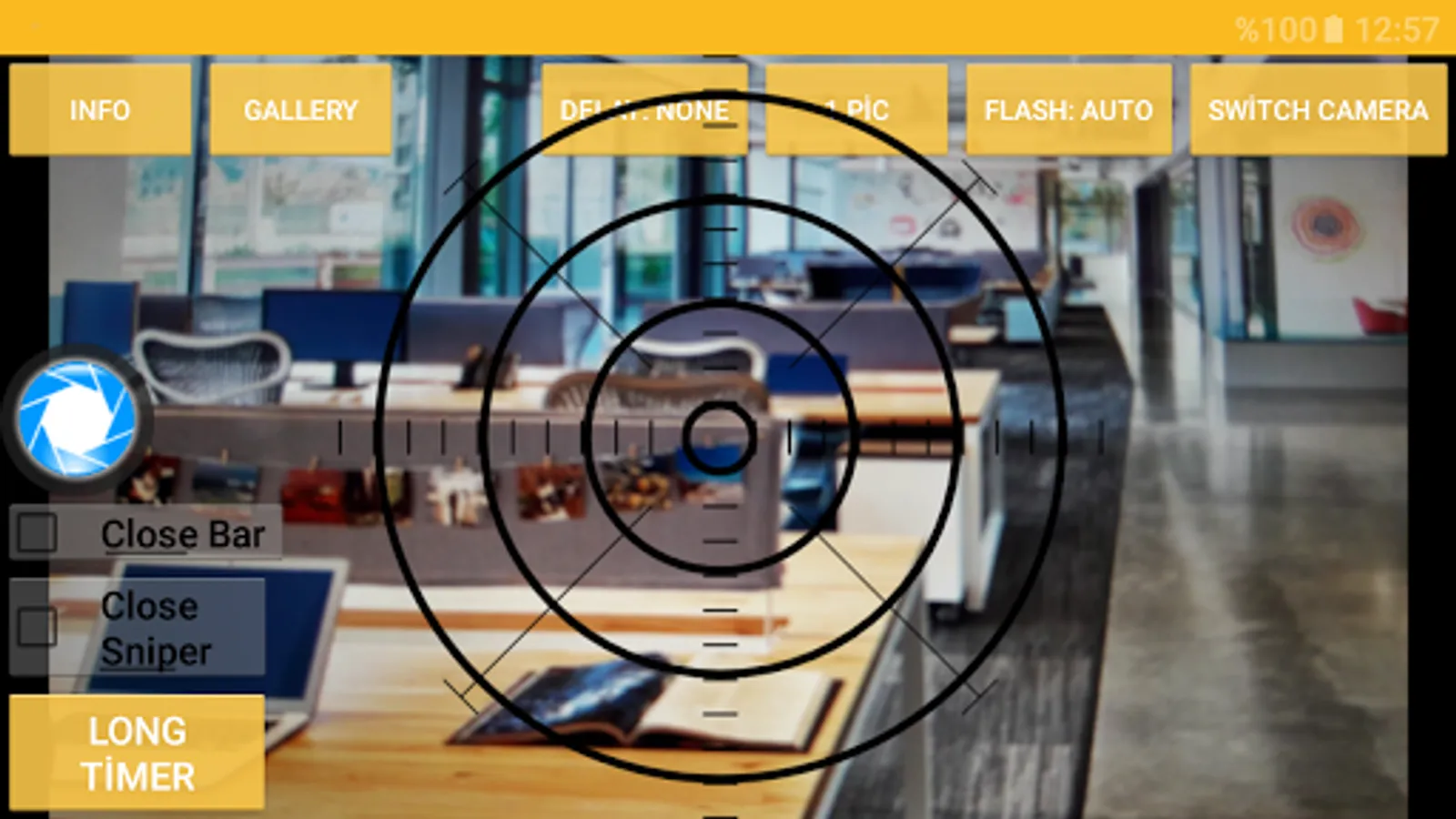 Camera Timer app takes photo and shares it with your friends.You may set a countdown before taking pictures at a time up to 24 hours. Including the number of shots in a continuous take. And Calibrating shutter scope by sniper scope. Camera Timer is the simple camera with a self-timer function. You can save and share the photo's which you like it and show it in order in the gallery. Camera Timer is the popular camera app in market that allows you to delay the shutter release for adjusted time and giving you time between pushing the button and taking the actual photo in clean filter.