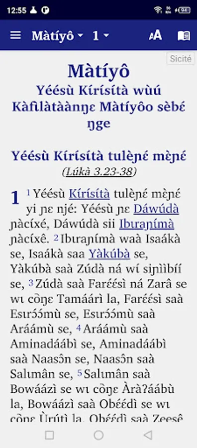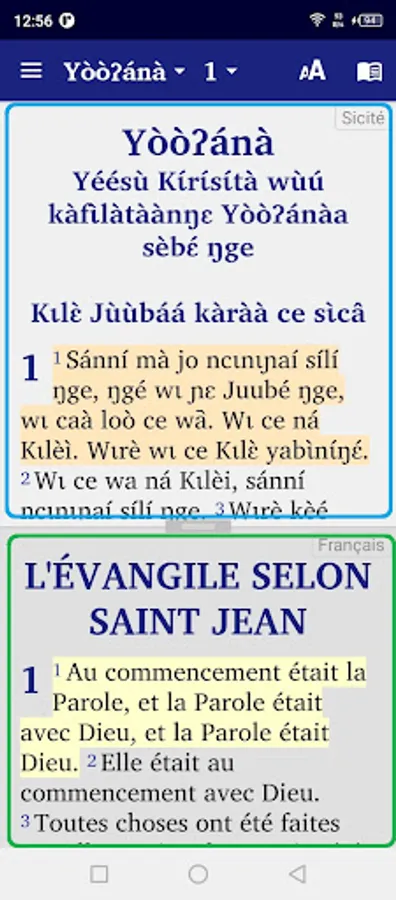 - "verse by verse" to display a verse in Sicité followed by the same verse in French or in English.