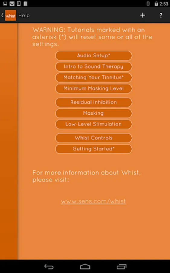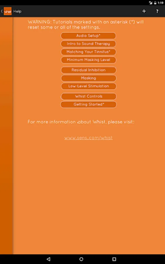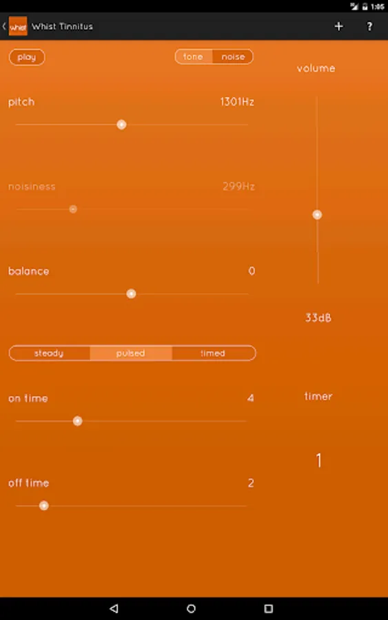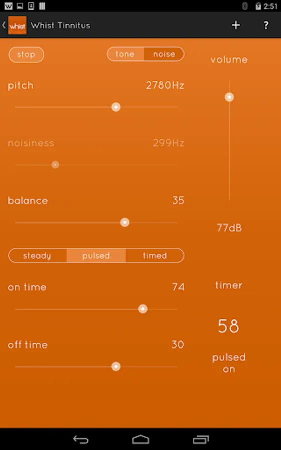 Based on clinical research on sound therapy, Whist provides a flexible and easy-to-use interface for masking and residual inhibition of tinnitus. Each of Whist’s controls adjusts an essential and easily-understood characteristic of the sound. By following the simple instructions that are provided, you will be able to match the pitch, noisiness and loudness of your tinnitus to find the best sound for your unique tinnitus relief.