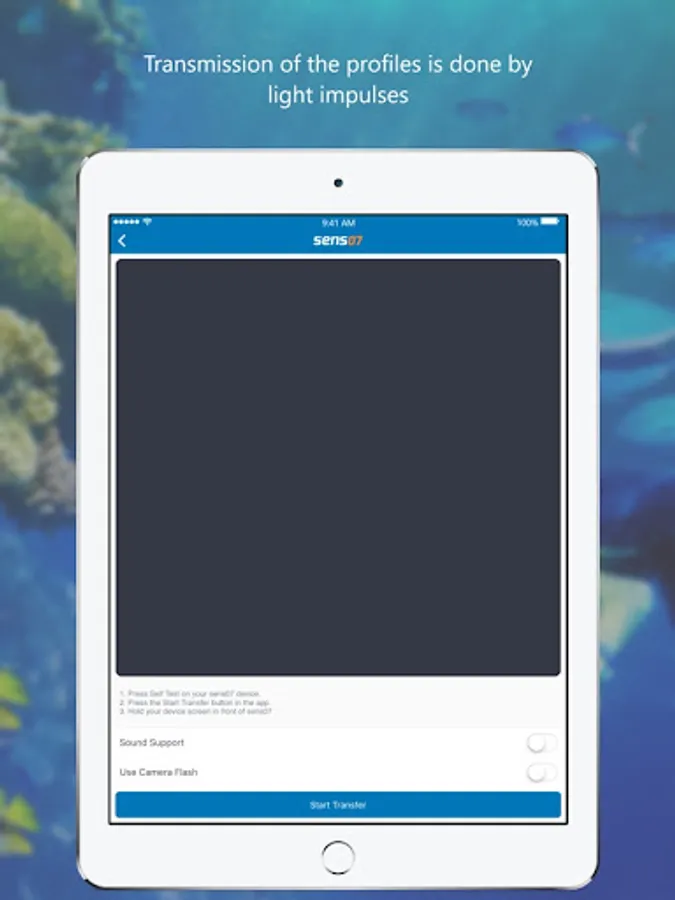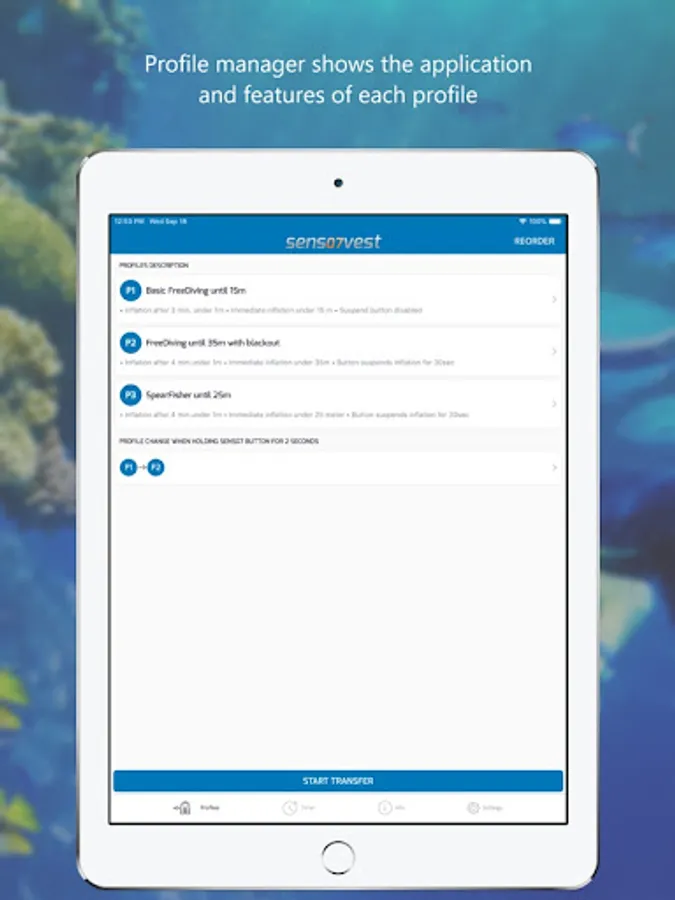 The safety parameters like maximal depth and maximal diving time can be configurated by using this sens07 smartphone app and transferred wirelessly to the sens07vest device.