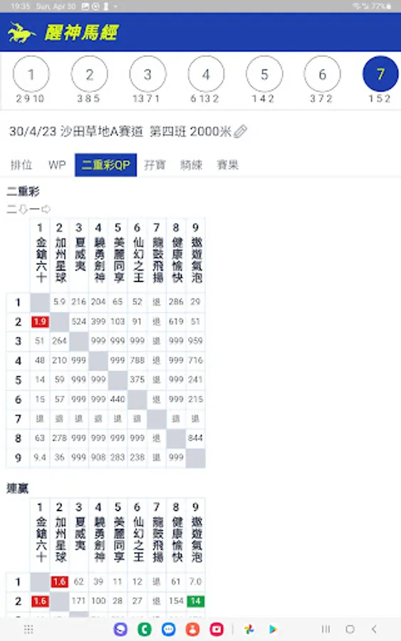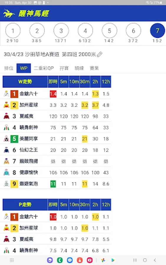 4. 賠率及走勢 - 提供最新的獨贏丶連贏、位置連贏、二重彩和孖寶賠率以及WP賠率走勢,並以黃格、綠格和啡格突出落飛注項,捕捉大戶信心票。