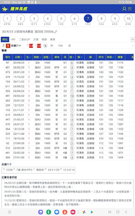 3. 馬匹詳細資料 - 版面清晰,參賽馬匹近20場往績、馬匹概況、近3場沿途走勢評述、近期試閘丶近5次晨操及傷患記錄等一應俱全;賽績表設有排序功能,可按日期、名次、跑道、途程、檔位、騎師、負磅等進行篩選,讓你分析各駒特點;點擊馬匹編號可自行以不同顏色燈標記心水馬匹。