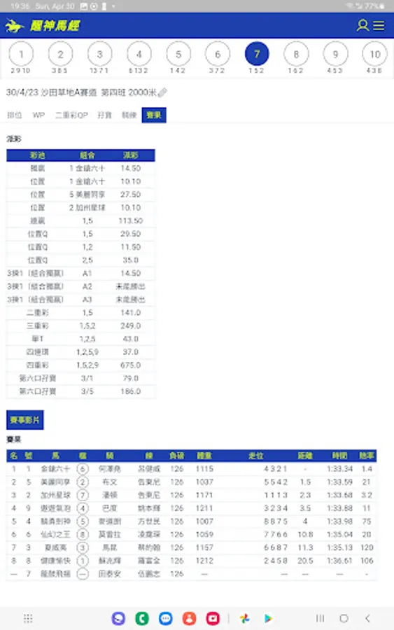 7. 賽果及派彩 - 前3名馬匹顯示在該場次號碼下面;點擊賽果按鈕可查看詳細賽果及派彩,並可重溫賽事影片丶走位圖等。