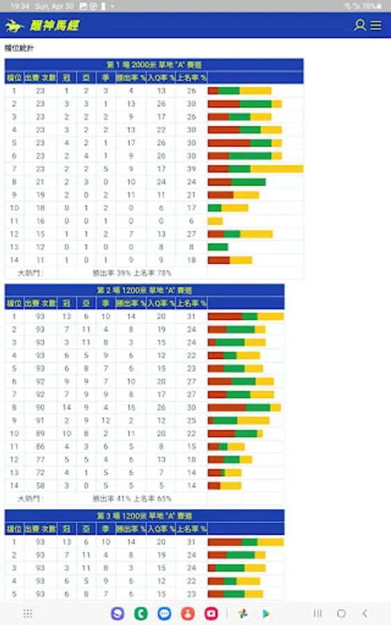 1. 檔位統計- 檔位及大熱門勝出/上名率用於分析各跑道路程排檔馬匹的爭勝機會。