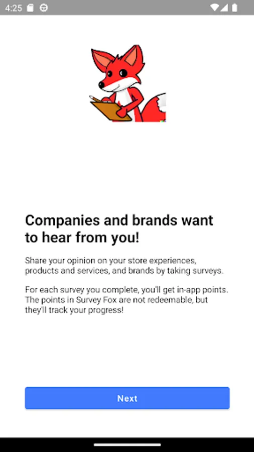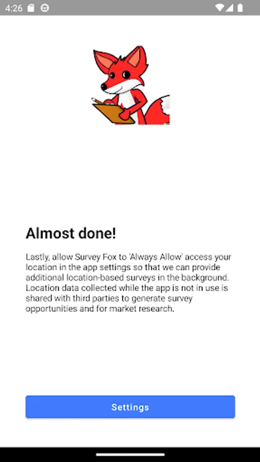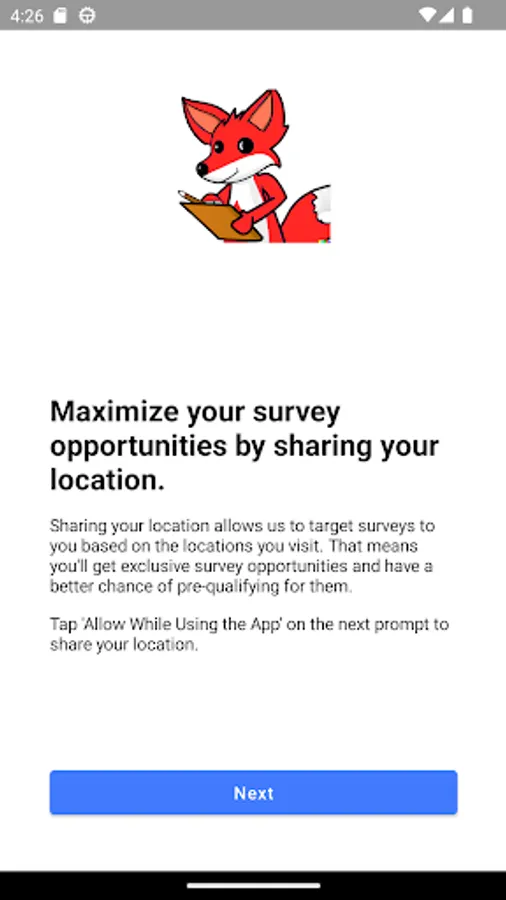 Survey Fox provides survey opportunities based on the places you visit by tracking your location in the background. Places visited may be eligible for certain surveys, of which you will be notified in-app or via optional notifications. Completed surveys will earn points, try to get the highest point score possible!