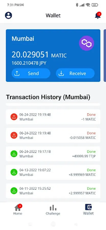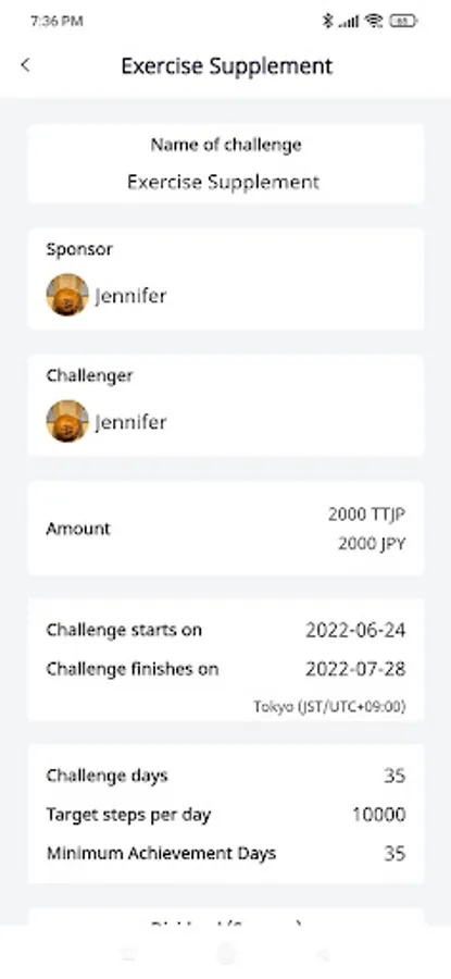In "Exercise Supplement", for example, you create a walking challenge such as walking more than 8,000 steps/day for 30 days, and deposit JPY 2,000 worth of Cryptocurrency or token to the blockchain as a deposit. It is possible to design that when the challenge is successful, the deposit will be returned to you and if the challenge is unsuccessful, the deposit will be paid to your friend. (2% of the operator fee will be deducted from the deposit. In addition, Blockchain fee called GAS will be incurred.)