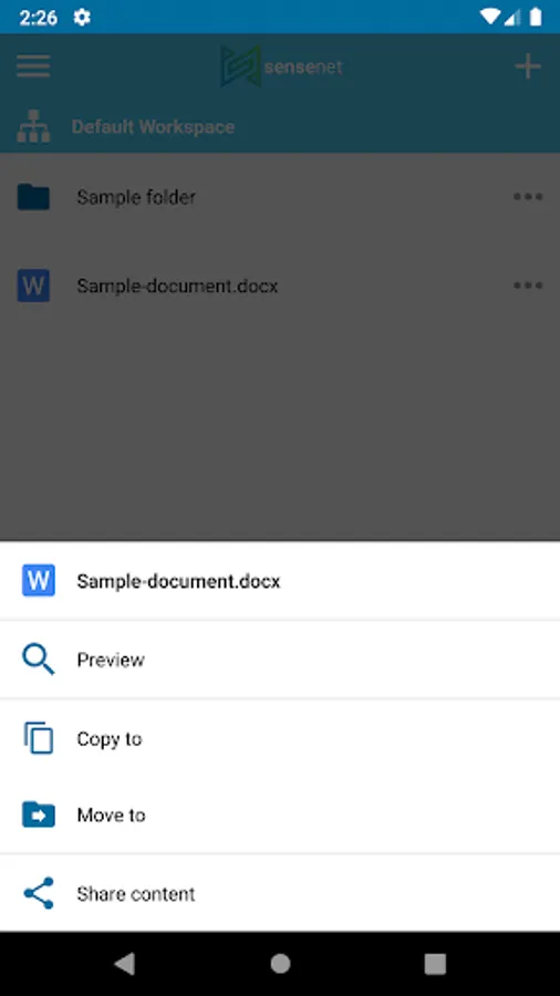 Share (with other apps). Share binary attachments from content items with other apps on the mobile phone (for example to forward them as email attachments).