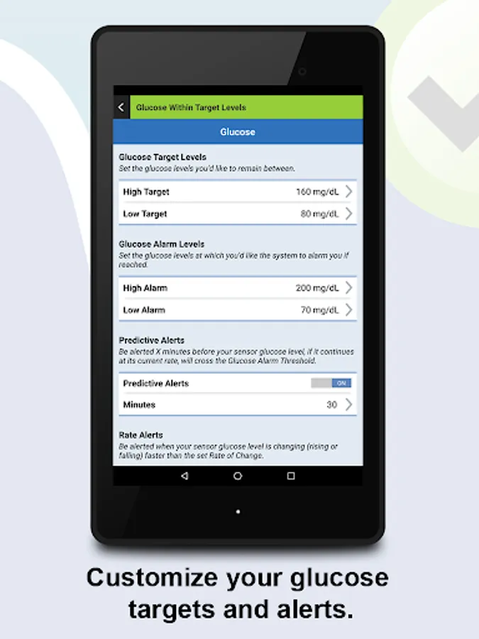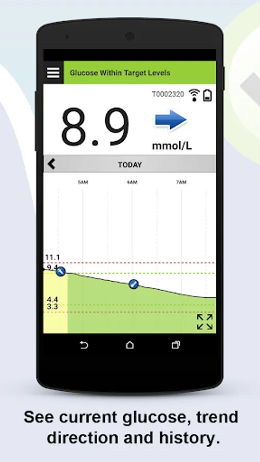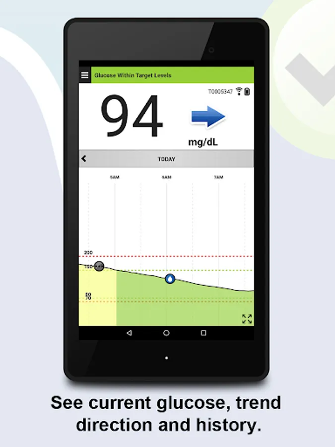 In addition to the current glucose value, the Eversense Mobile App provides alerts for hypo and hyperglycemia based on the settings you enter. It also displays the rate and direction of glucose changes, and provides the ability to enter glucose-related events like meals, insulin and exercise. The Eversense CGM mobile app is also compatible with the Eversense NOW Remote Monitoring mobile app.