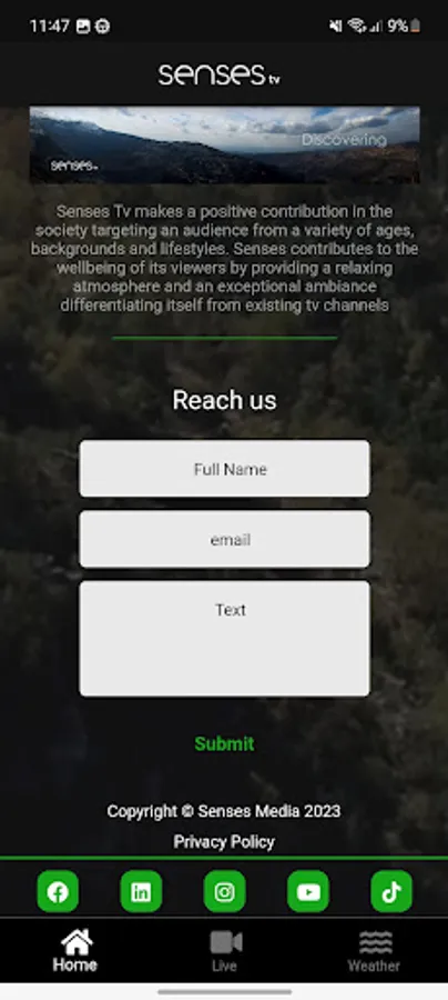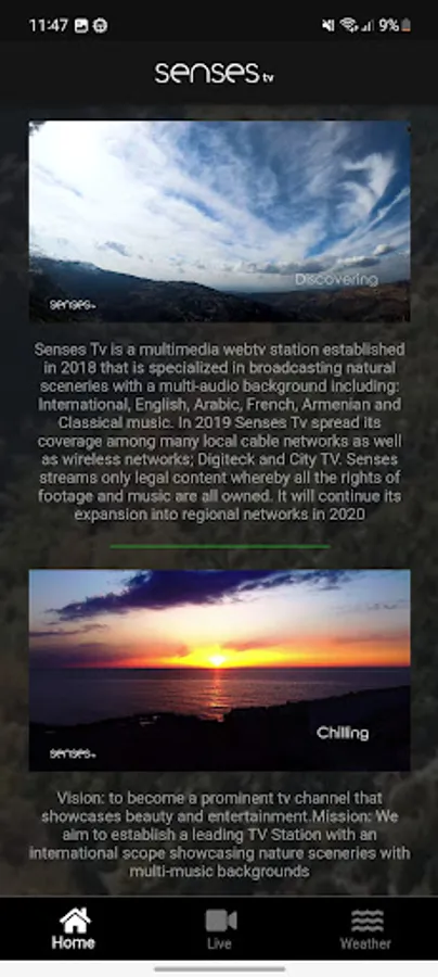 Senses Tv is a multimedia webtv station established in 2017 based in Lebanon that is specialized in broadcasting natural sceneries with a multi-audio background including: International, English, Arabic, French, Armenian and Classical music. In 2019 Senses Tv spread its coverage among many local cable networks as well as wireless networks;Cable vision, Digiteck and City TV and samaflix for local iptv as for international coverage available on mysatgo app and dish sling network. Senses streams only legal content whereby all the rights of footage and music are all owned.It will continue its expansion into regional networks in 2023