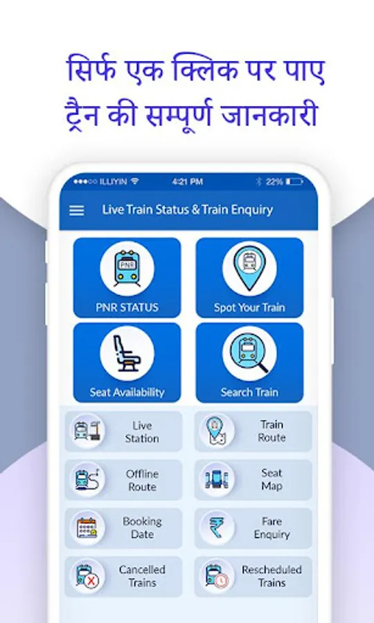 This Live Train Status And Train Enquiry app is a unique train app that offers you Indian train live status ,PNR status ,Seat Availability , Train Between station ,Live Station Status, Train coach seat map and many more.