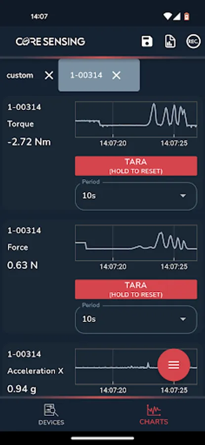 A REC button is used to start or end a recording of the measured variables, which is saved as a CSV file on the device.