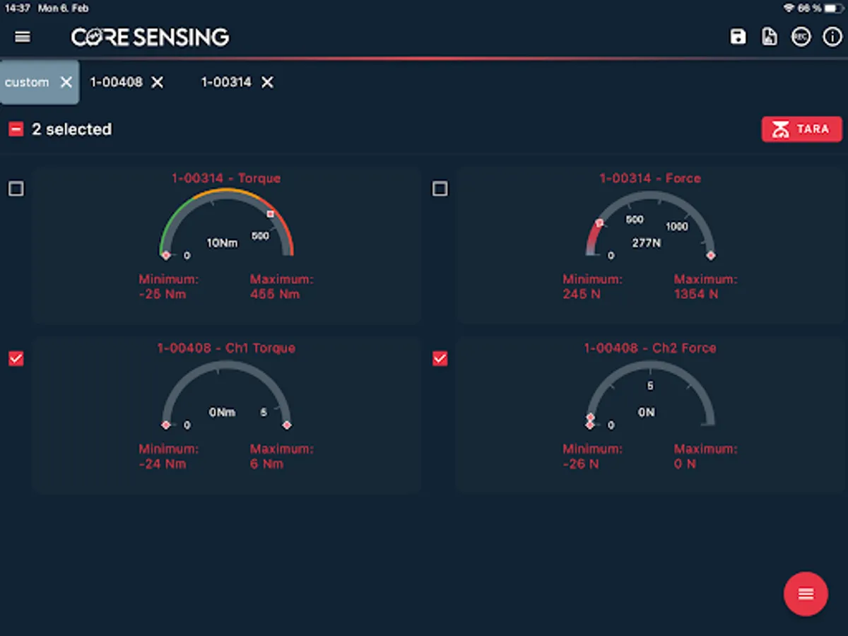 Measurement data are clearly displayed on the dashboard. For each measured value, the average value is displayed with min / max values, the time interval is configurable. The measured values can be reset by a tare function (to zero).
