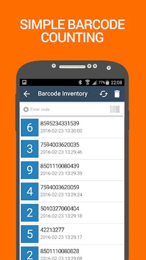 Simple counting barcodes for inventory. Track your items easy and quick. Using integrated camera barcode plugin.