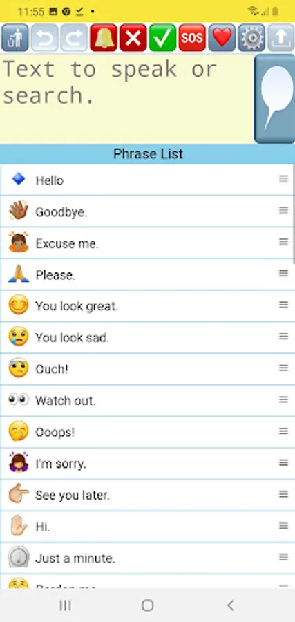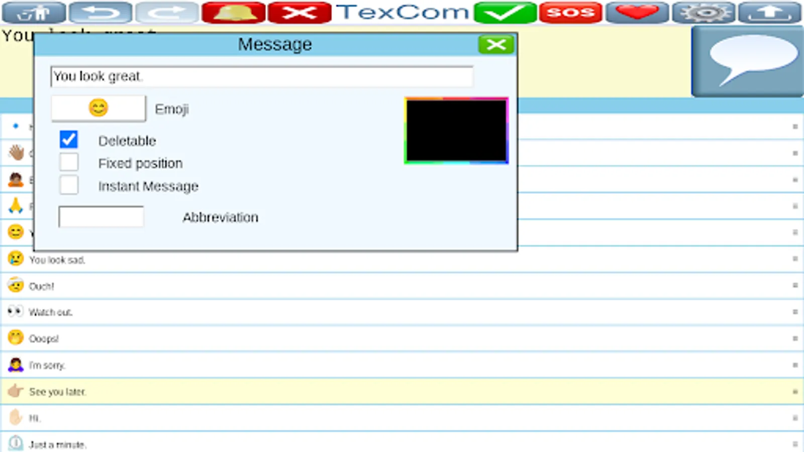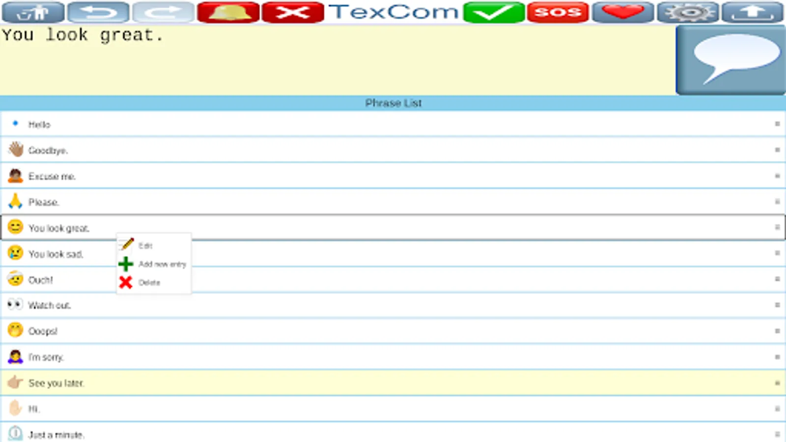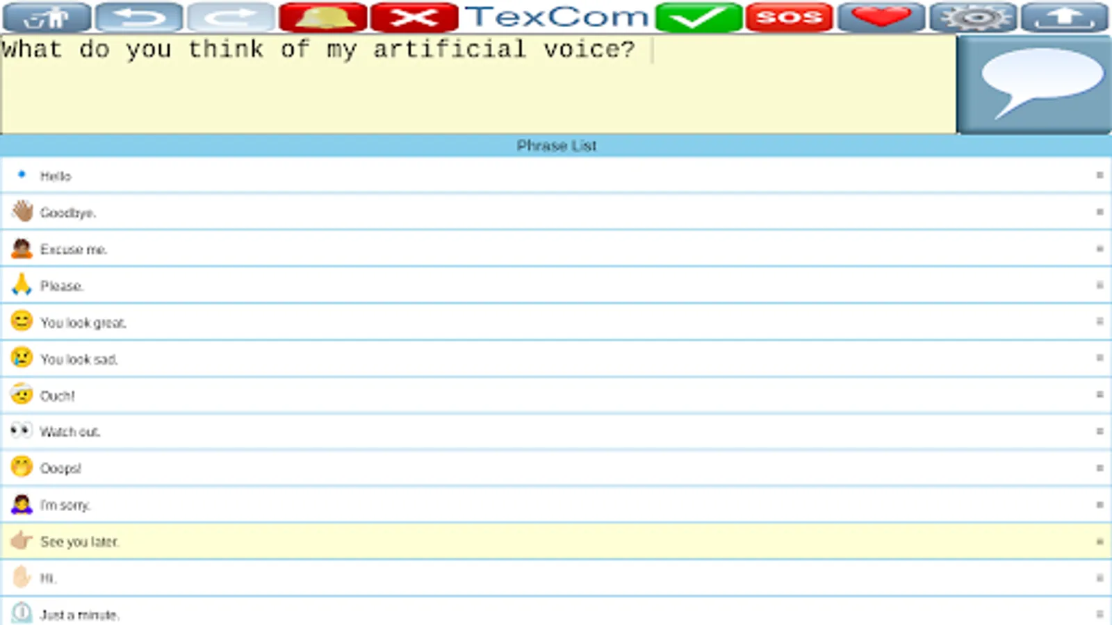 TexCom includes a set of easy communicate buttons, including a bell sound, SOS sound, Yes/No and Add Phrase to your phrase list.