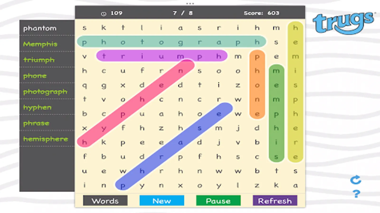 Trugs® is a structured phonics based English reading resource for school and home. Trugs Word Search 3 is a challenging structured word finder app to help read and identify words from the same Trugs phonics stage. This app is supplemental to the Trugs literacy card games and related activities, or can be used on its own.