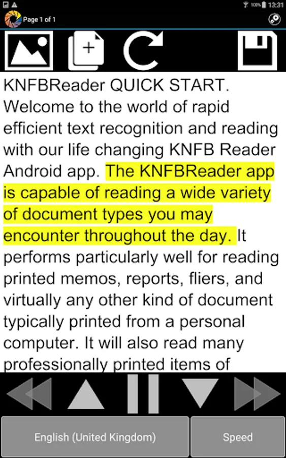 The app helps you get a good photo with viewfinder assist, tilt assist, and automatic text detection. It navigates by line, sentence, word, or character and has synchronized text highlighting. It can read multiple pages and is fully accessible using Google TalkBack.