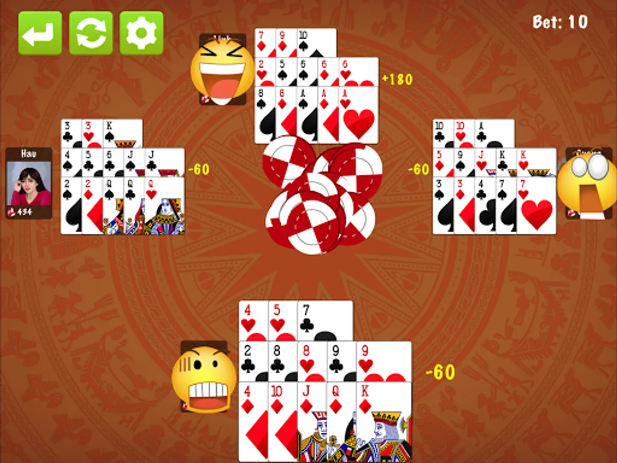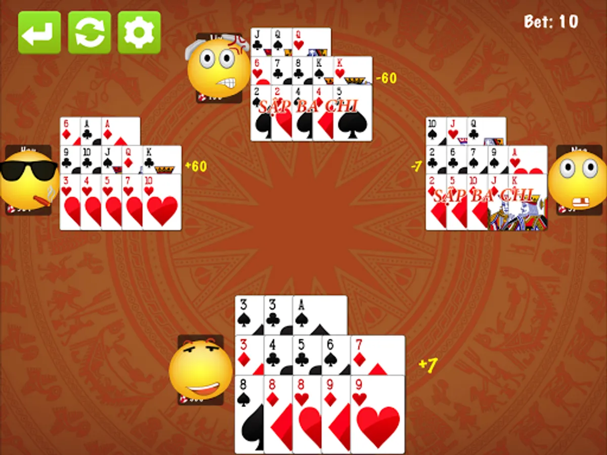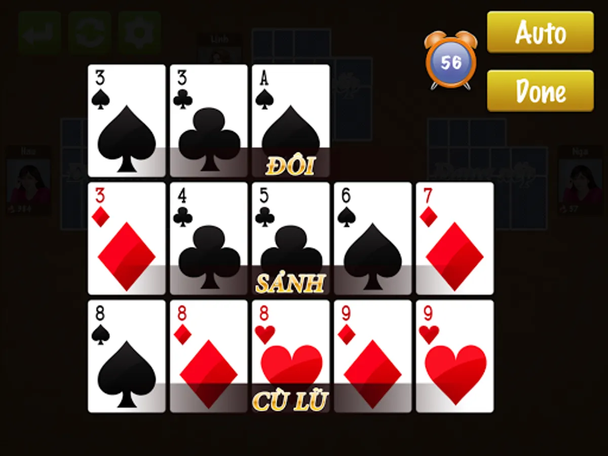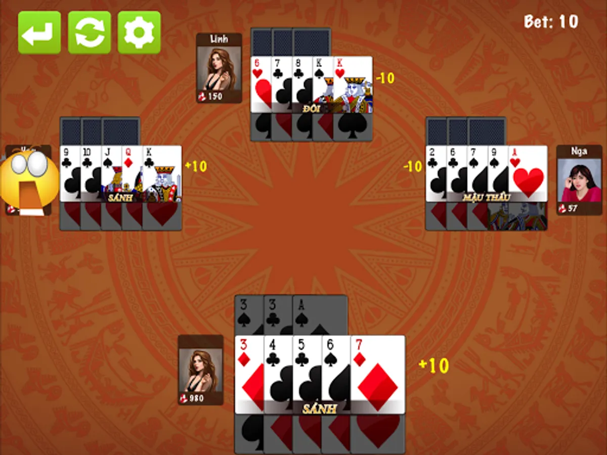 Mau Binh card game is the fascinating, amusing effective game for everyone. If you're in the mood to play but alone or missing friends, this game is the best fit for you. You just turn on the device, enter the game, the virtual opponents with perfect playing skills are awaiting you. We, the studio had success with the famous classic games such as Gold Miner, Lines 98, Shoot eggs guarantee the quality of this game.