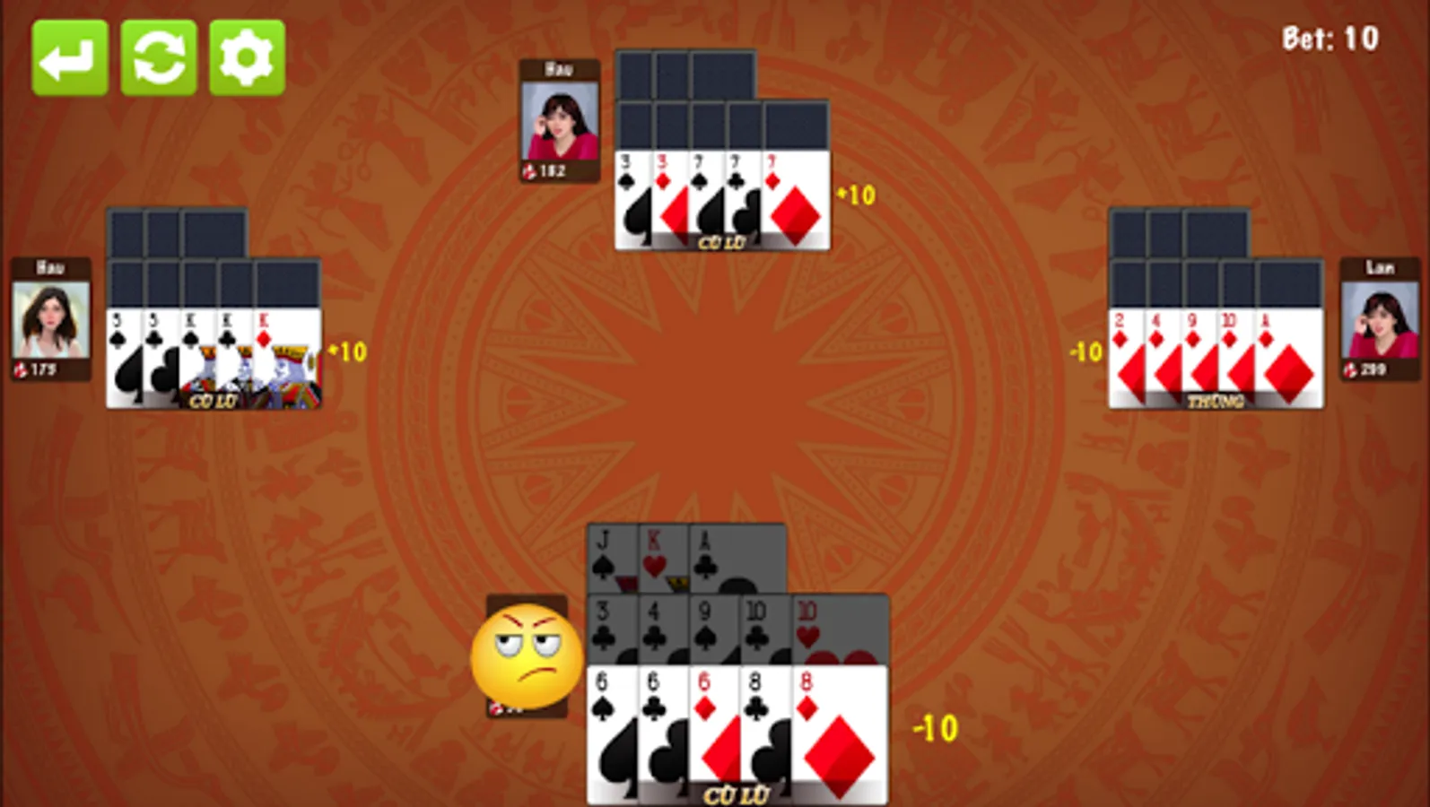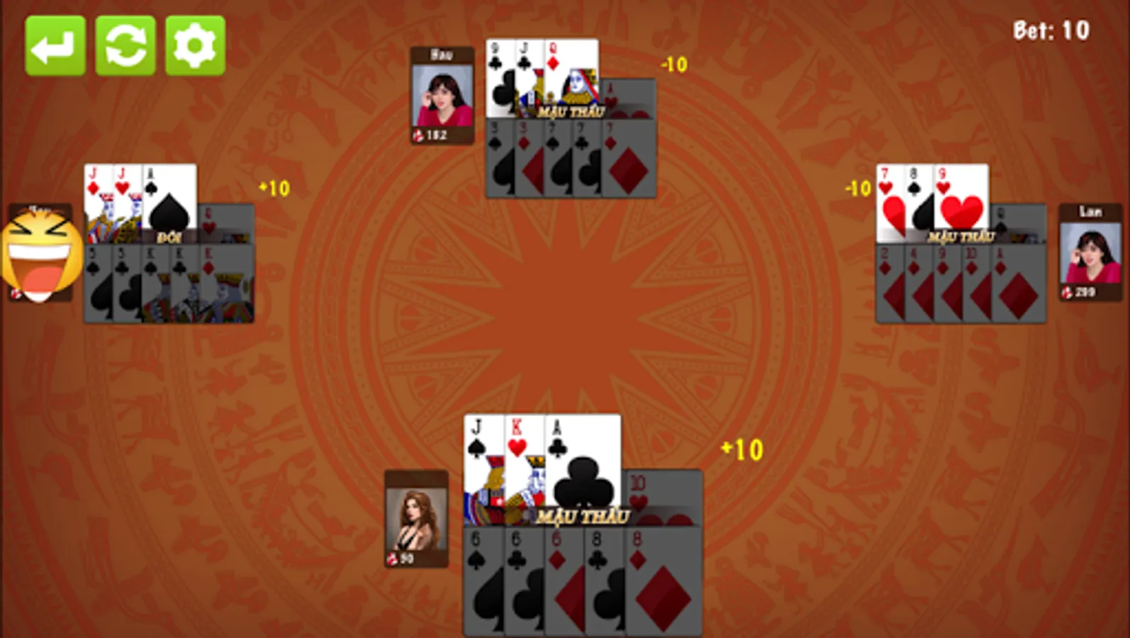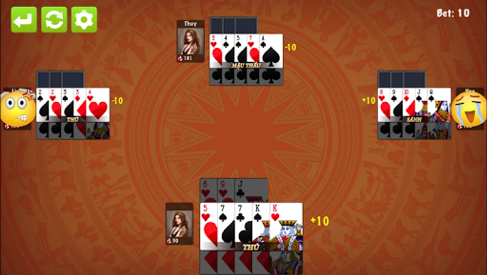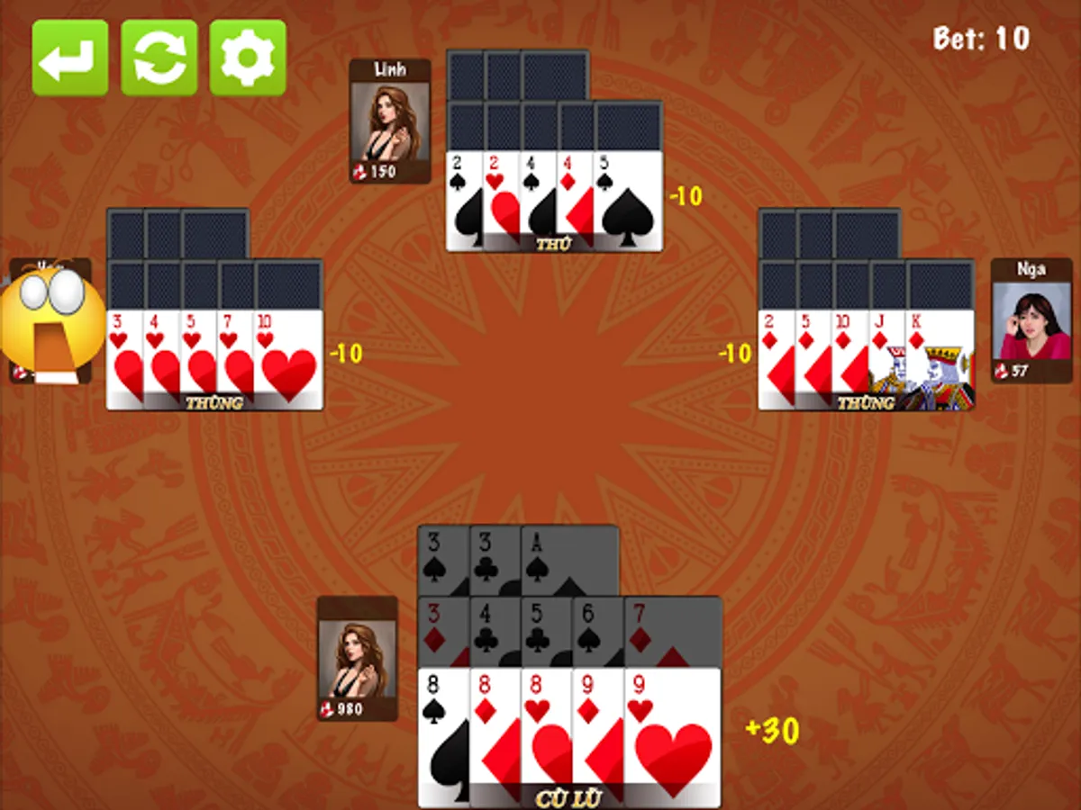 Mau Binh card game is the fascinating, amusing effective game for everyone. If you're in the mood to play but alone or missing friends, this game is the best fit for you. You just turn on the device, enter the game, the virtual opponents with perfect playing skills are awaiting you. We, the studio had success with the famous classic games such as Gold Miner, Lines 98, Shoot eggs guarantee the quality of this game.