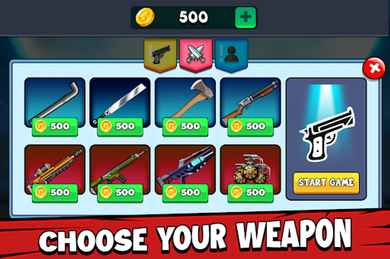 🔫 Various Weapons to choose : Machine gun, Short gun, Sniper, Pistol, Laser, Bomb, Pipe, Machete, Sword, Axe.