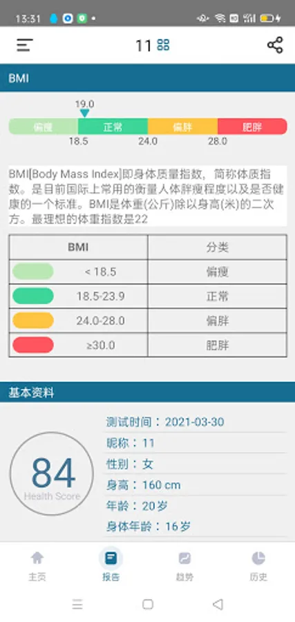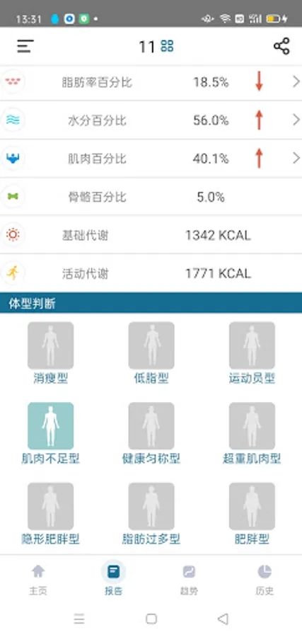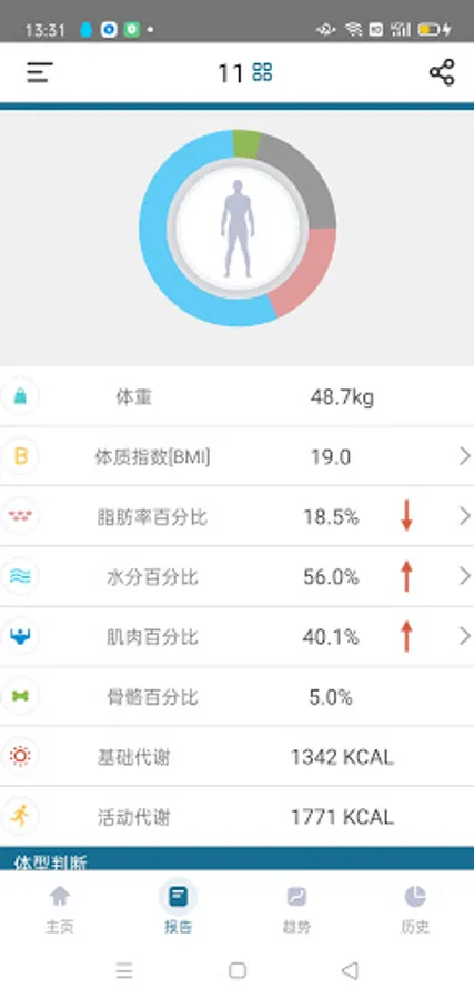 The application is connected with Senssun scale. The data is measured by the scale and uploaded to the App. The App report shows various indicators of the human body, such as fat percentage, water percentage, muscle percentage, skeletal muscle percentage, AMR , BMR, and display the body shape status in the form of nine square grids. You can also view the historical data by switching the date.