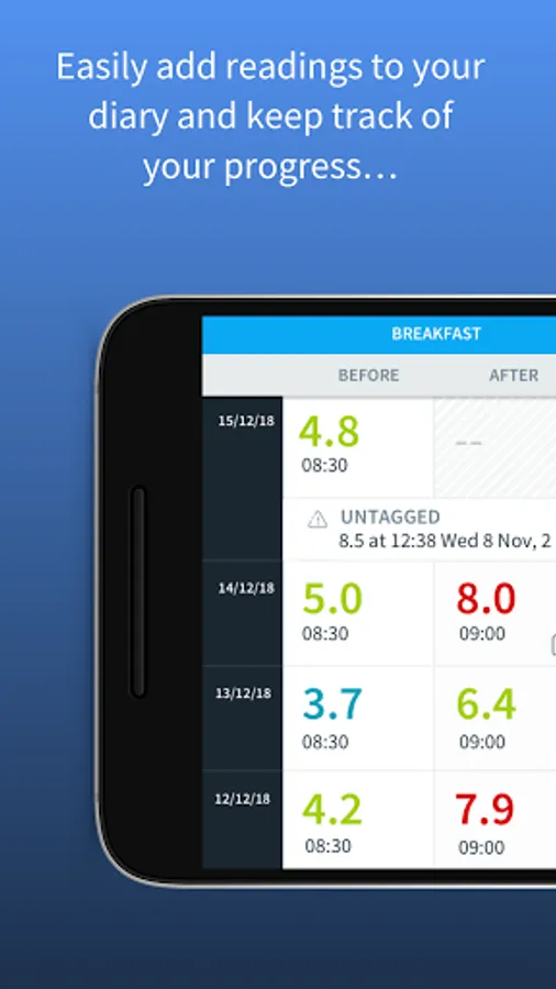 - Track your readings and view historical readings as a list, in diary format, or as a graph