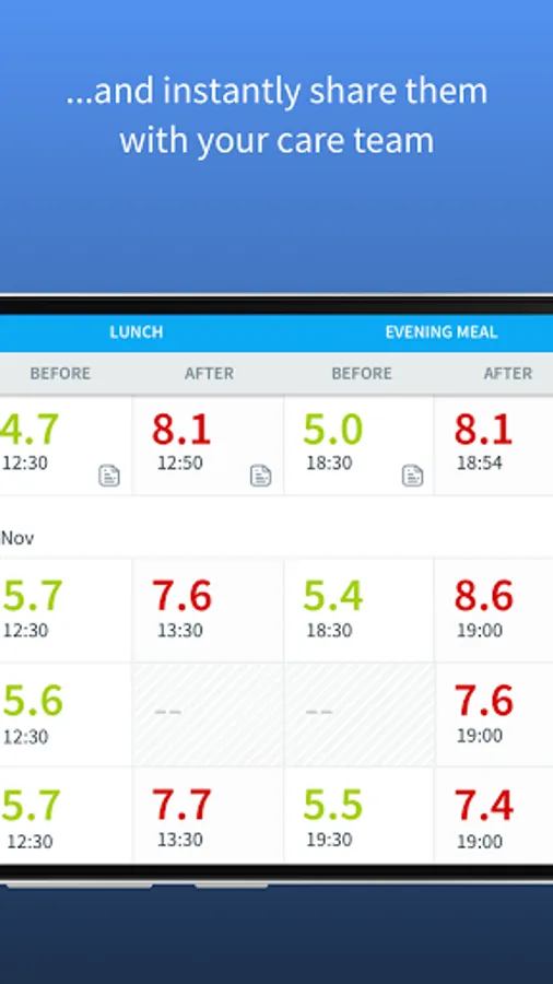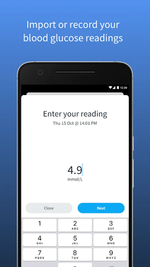 - Upload blood glucose readings either directly from your personal glucometer via Bluetooth, or by entering them manually