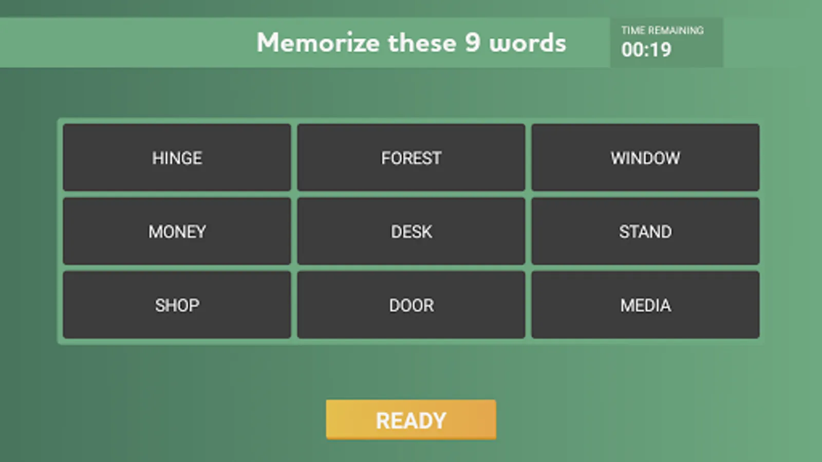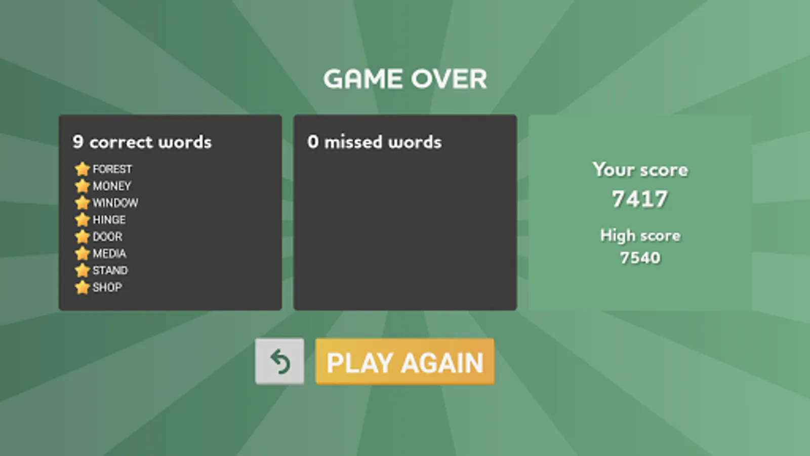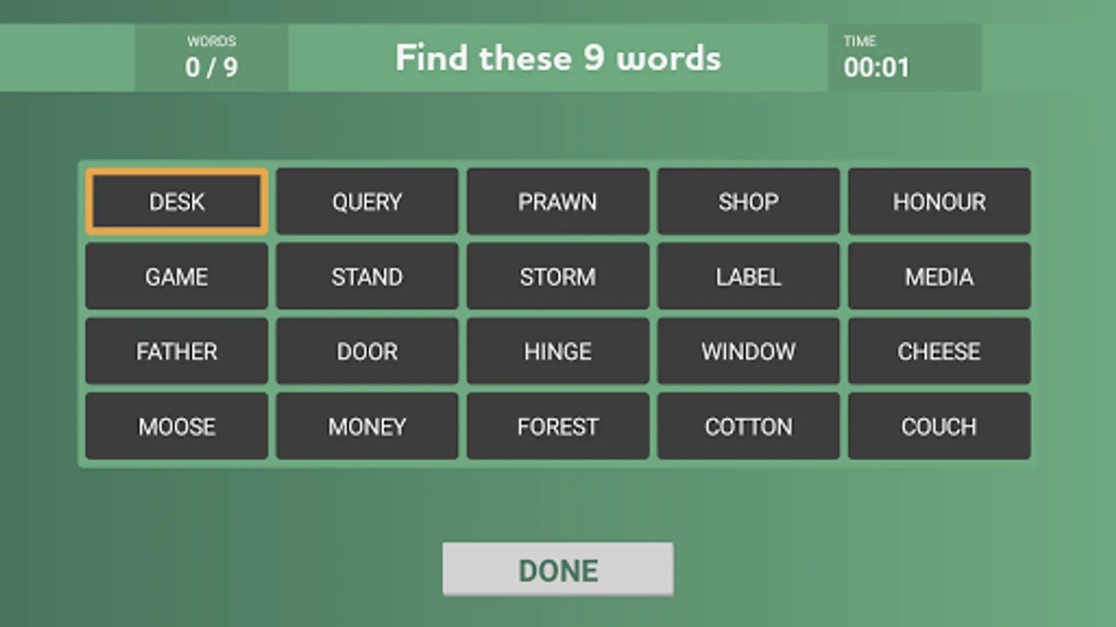 Memorize 9 words in 20 seconds and then find those words from 20 words. The faster the player finds the correct words the better the score will be.